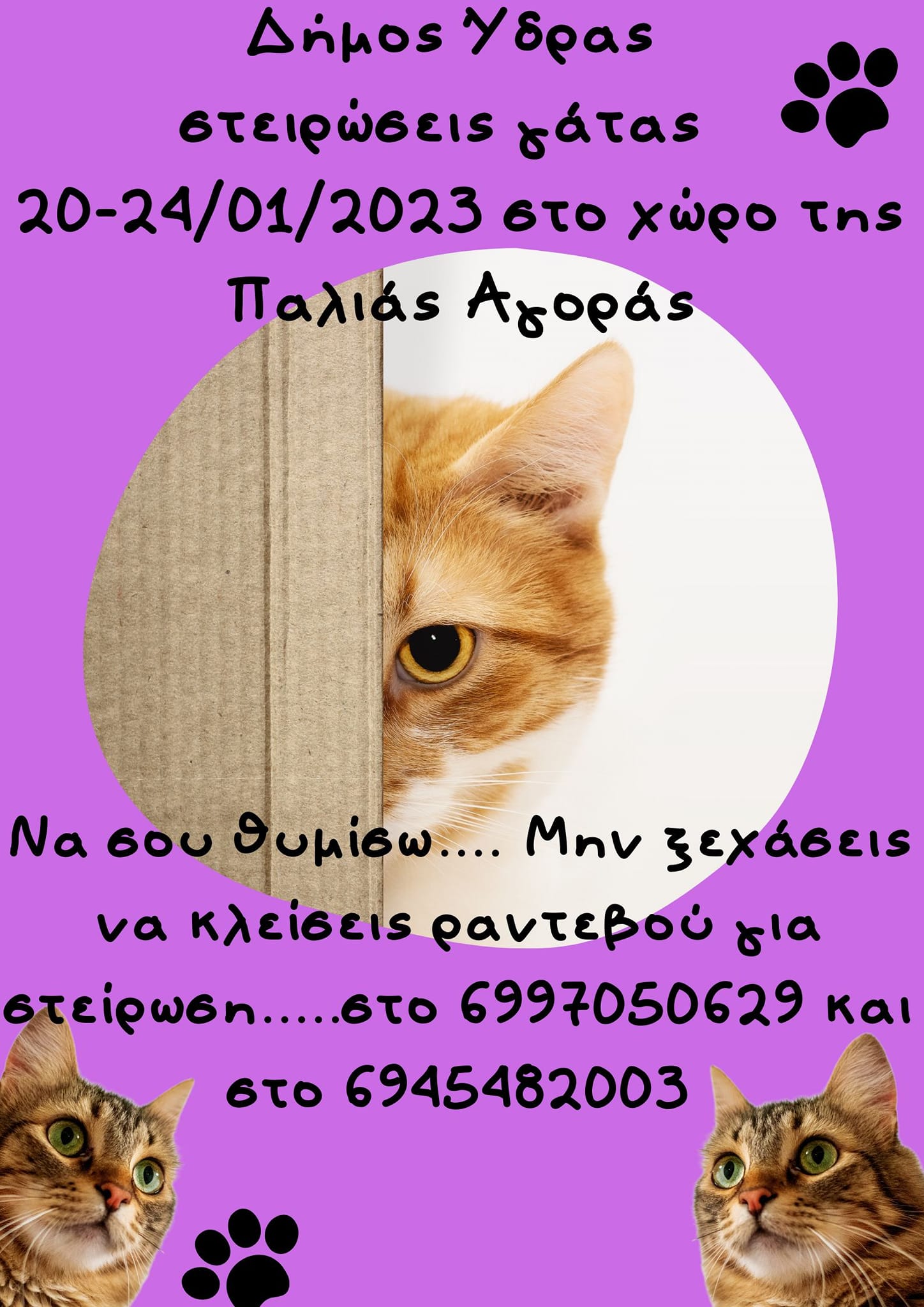 Το διάστημα από Παρασκευή 20 Ιανουαρίου έως την Τρίτη 24 Ιανουαρίου 2023 στον χώρο της Δημοτικής Αγοράς, η κτηνιατρική ομάδα της κα. Κοτζαμπασάκη《ANIMED》θα βρίσκεται στο Νησί μας όπου θα πραγματοποιήσει δωρεάν στειρώσεις στις αδέσποτες γάτες και περιθάλψεις όπου αυτό χρειαστεί.