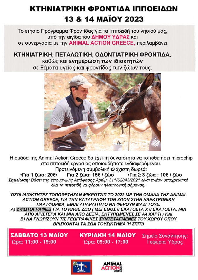 Ο Δήμος Ύδρας, σύμφωνα με ενημέρωση της Αντιδημάρχου Μαίρης Κάτσικα, έχοντας ως βασική προτεραιότητα την ευζωία των ιπποειδών του Νησιού μας, υλοποιεί και φέτος το πρόγραμμα φροντίδας για τα ιπποειδή σε συνεργασία με την ANIMAL ACTION HELLAS στις 13-14 Μαΐου 2023 και ώρες 11:00 π.μ. με 19:00 μ.μ. και 9:00 π.μ. με 17:00 μ.μ. αντίστοιχα, στα Γεφύρια της Ύδρας.