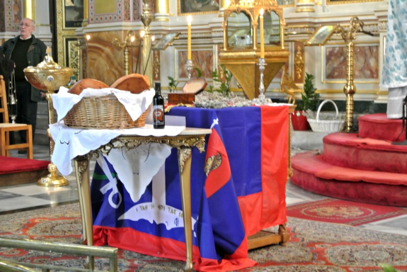 Τελέστηκε λοιπόν Δοξολογία και Αρτοκλασία, ενώ πάνω στη σημαία της Ύδρας που ήταν τοποθετημένη στον Ναό, βρισκόταν το ιερό λείψανο του Αγίου. Αξίζει να σημειωθεί ότι καλάθια γεμάτα φασκομηλιά από το νησί μας ήταν σε διάσπαρτα σημεία του Ναού. Η φασκομηλιά που έπαιρνε ο κόσμος μαζί του όταν έφευγε, ευωδίαζε γνώριμα, και ήταν προσφορά της οικογένειας Γεωργίου Λαβούτα.