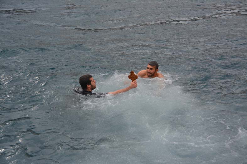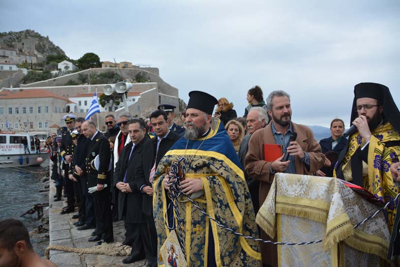 Κατόπιν στον κατεβασμό, οι πιστοί παρακολούθησαν την κατάδυση του τιμίου σταυρού στη θάλασσα στον λιμενοβραχίονα όπου δυο θαρραλέοι νέοι με ενθουσιασμό και αψηφώντας την παγωνιά έπεσαν στη θάλασσα για να "πιάσουν" τον σταυρό. Ο Ανδρέας Θεοδοσίου ήταν αυτός που ανέσυρε τον σταυρό και έλαβε ως ευλογία επιστήθιο σταυρό, χορηγία του Κοινωφελούς Ιδρύματος Ύδρας Στυλιανού και Μαρίας Βέτιμη. Πλήθος κόσμου τους παρακολούθησε στον λιμενοβραχίονα αλλά και από την απέναντι πλευρά στην παραλία.