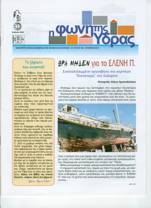 Μια ανάσα πριν τη θάλασσα, εκεί που πρωτοβγήκε, εκεί και έμεινε... Δώδεκα ολόκληρα χρόνια τώρα περιμένει παρατημένο και ελπίζει στη διάσωσή του. Ο κ. Κουπετώρης θυμάται τη στιγμή που ήρθε στο καρνάγιο το «ΕΛΕΝΗ Π.» και μας λέει: «Μας το έφερε το Μουσείο της Ύδρας με κάποιο φέρι-μποτ. Είχαν πάρει ανέλκυση από το Λιμεναρχείο. Ήταν απόγευμα και το σκαρί έμπαζε νερά, βούλιαζε, παιδευτήκαμε πολύ. Από τότε μέχρι σήμερα δεν πήραμε μία δραχμή γι' αυτό το σκάφος».