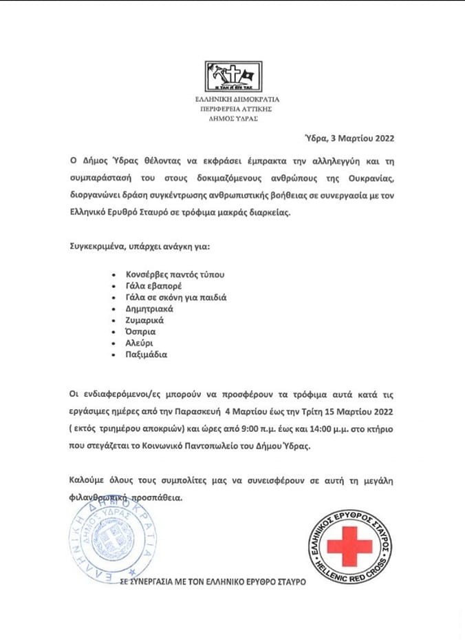 Δράση συγκέντρωσης ανθρωπιστικής βοήθειας για την Ουκρανία διοργανώνει ο Δήμος Ύδρας σε συνεργασία με τον Ελληνικό Ερυθρό Σταυρό.