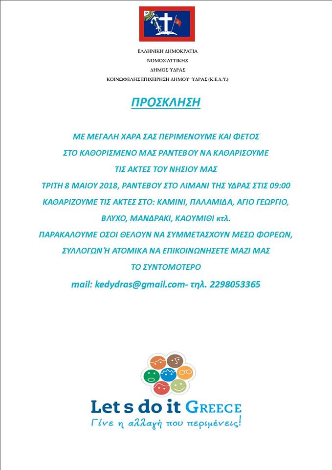 Στην πανελλήνια εθελοντική εκστρατεία συμμετέχει η Κοινωφελής Επιχείρηση του Δήμου Ύδρας η οποία καλεί φορείς, συλλόγους και μεμονωμένους συμπολίτες μας να λάβουν μέρος.