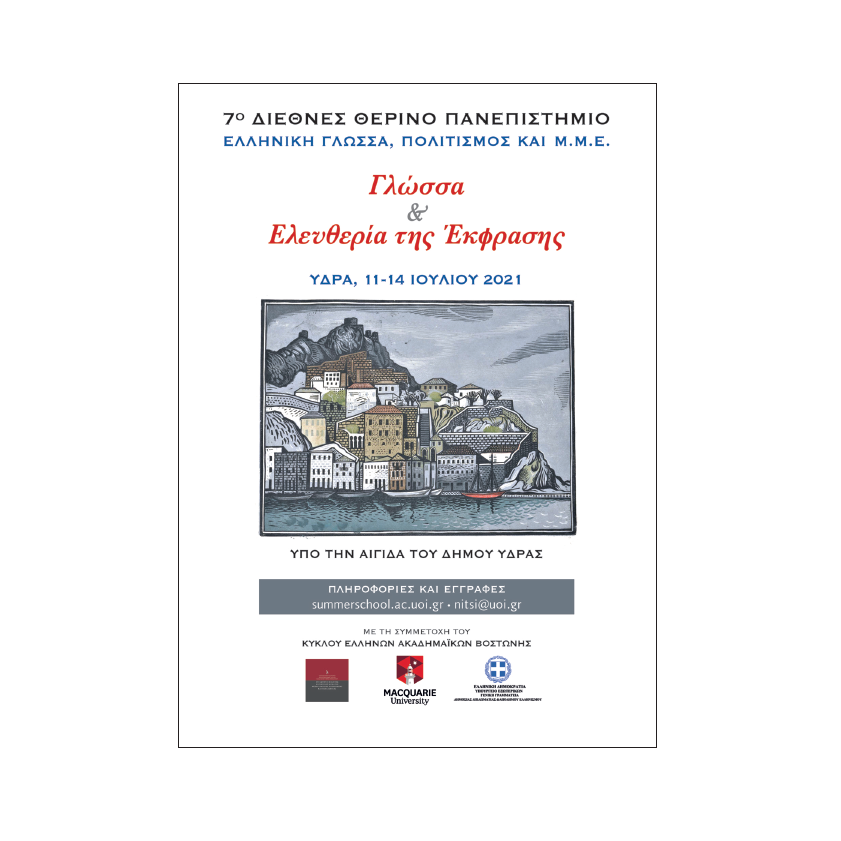 Το Πανεπιστήμιο Ιωαννίνων – Σχολή Επιστημών Αγωγής, Παιδαγωγικό Τμήμα Νηπιαγωγών και το Εργαστήριο Μελέτης Κοινωνικών Θεμάτων, Μέσων Ενημέρωσης και Εκπαίδευσης του Π.Τ.Ν., σε συνεργασία με το Πρόγραμμα Νεοελληνικών Σπουδών του Τμήματος Μέσων Μαζικής Ενημέρωσης, Επικοινωνίας, Καλών Τεχνών, Γλωσσών και Λογοτεχνίας της Σχολής Ανθρωπιστικών Σπουδών του Macquarie University (Department of Media, Communications, Creative Arts, Language and Literature, Faculty of Arts), στο Σίδνεϋ της Αυστραλίας, και με τη συμμετοχή του Κύκλου Ακαδημαϊκών της Βοστώνης (The Circle of Hellenic Academics in Boston) διοργανώνει το 7ο Διεθνές Θερινό Πανεπιστήμιο «Ελληνική Γλώσσα, Πολιτισμός και ΜΜΕ». Η δράση προγραμματίζεται να πραγματοποιηθεί στην Ύδρα από 11-14 Ιουλίου 2021 (εφόσον οι συνθήκες το επιτρέπουν), στην αίθουσα τέχνης και συναυλιών "Mελίνα Mερκούρη". Το Διεθνές Θερινό Πανεπιστήμιο εντάσσεται στο επετειακό πρόγραμμα για τα 200 χρόνια από την Ελληνική Επανάσταση και τελεί υπό την αιγίδα του δήμου Ύδρας. Υποστηρίζεται επίσης από τη Γενική Γραμματεία Δημόσιας Διπλωματίας και Απόδημου Ελληνισμού του Υπουργείου Εξωτερικών.