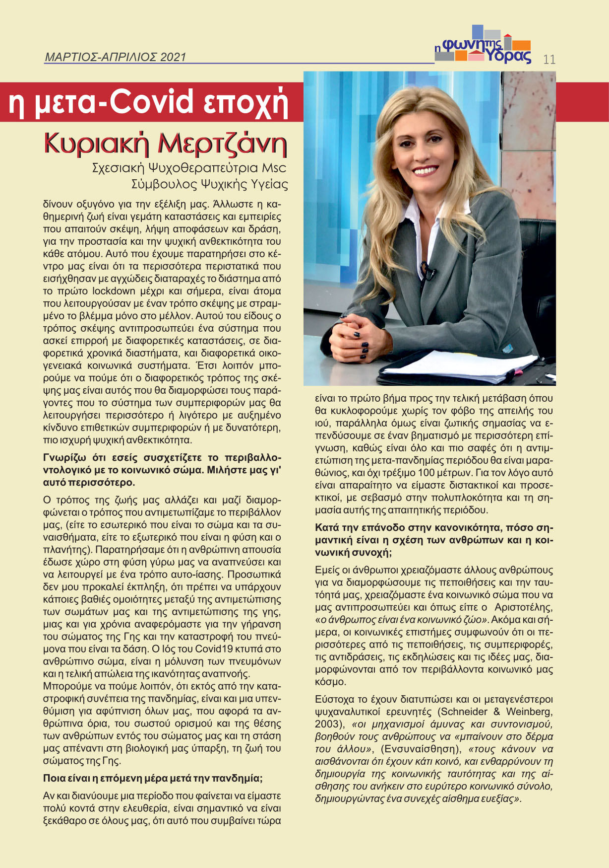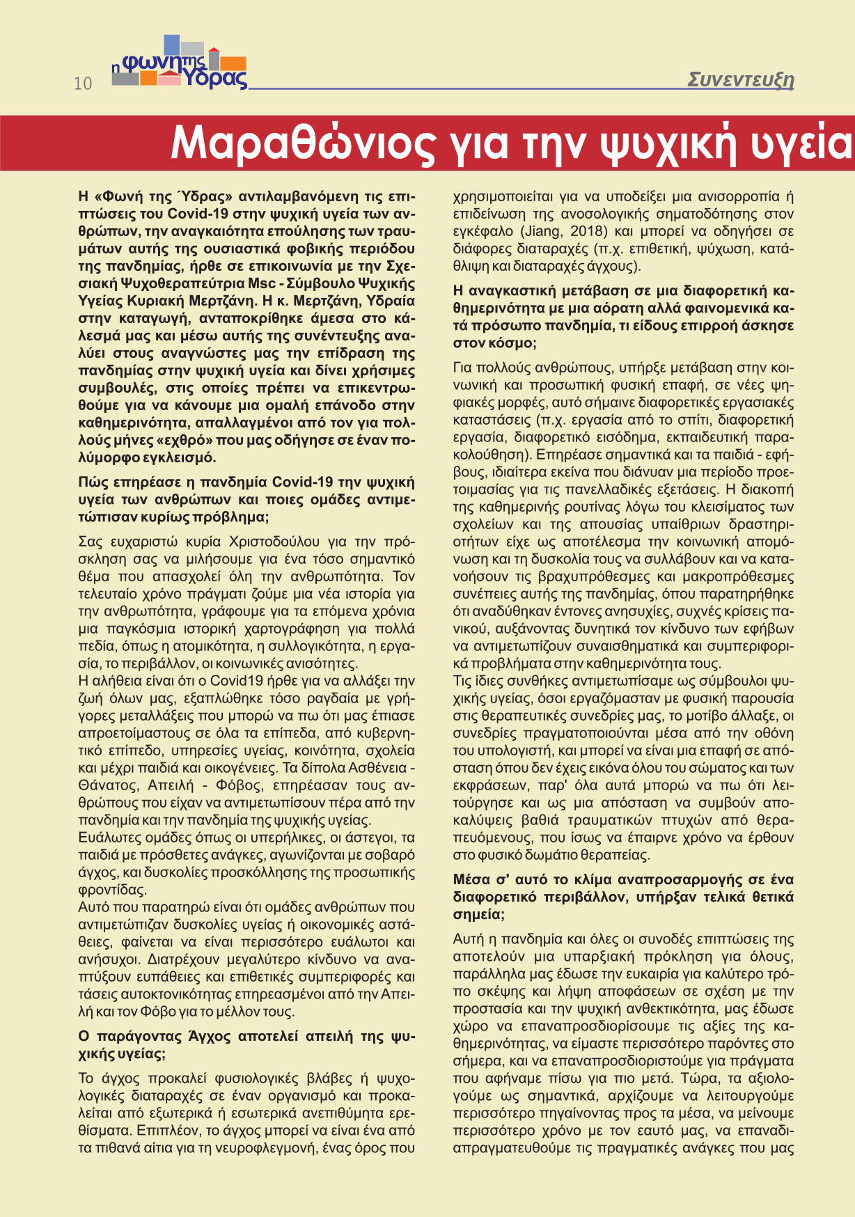 Η κ. Μερτζάνη, Υδραία στην καταγωγή, ανταποκρίθηκε άμεσα στο κάλεσμά μας και μέσω αυτής της συνέντευξης αναλύει στους αναγνώστες μας την επίδραση της πανδημίας στην ψυχική υγεία και δίνει χρήσιμες συμβουλές, στις οποίες πρέπει να επικεντρωθούμε για να κάνουμε μια ομαλή επάνοδο στην καθημερινότητα, απαλλαγμένοι από τον για πολλούς μήνες «εχθρό» που μας οδήγησε σε έναν πολύμορφο εγκλεισμό.