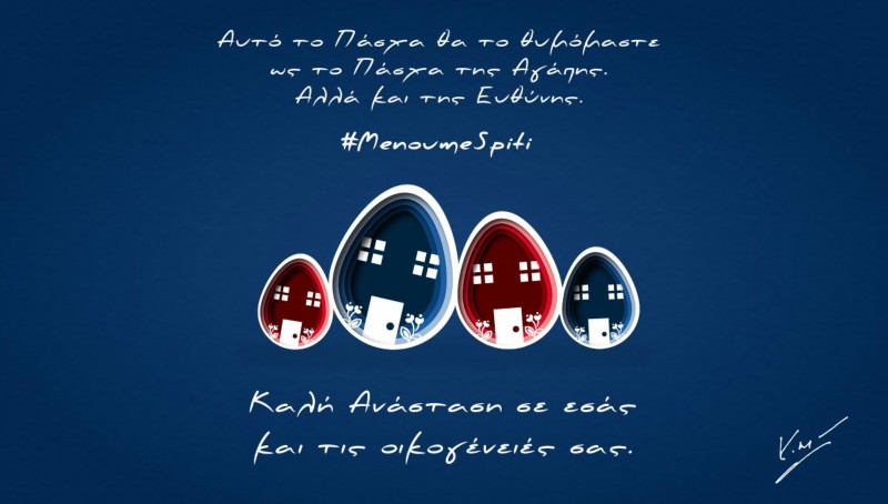 Ο πρωθυπουργός δημοσίευσε και μια ευχετήρια κάρτα με το μήνυμα: «Αυτό το Πάσχα θα το θυμόμαστε ως το Πάσχα της αγάπης. Αλλά και της ευθύνης. #MenoumeSpiti Καλή Ανάσταση σε εσάς και τις οικογένειές σας».