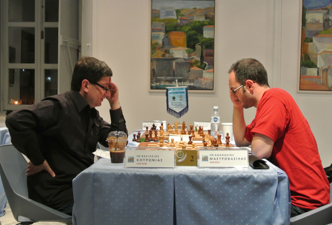 Στο 65ο Ατομικό Πρωτάθλημα στην κρίσιμη μάχη των πρωτοπόρων ο Θάνος Μαστροβασίλης αμύνθηκε με ακρίβεια με τα μαύρα στο άνοιγμα του Βασίλη Κοτρωνιά και απέκτησε σταδιακά το πλεονέκτημα στην παρτίδα. Ένα αναπάντεχο λάθος του όμως στην 44η κίνηση έδωσε την ευκαιρία στον αντίπαλο να διεκδικήσει τη νίκη.