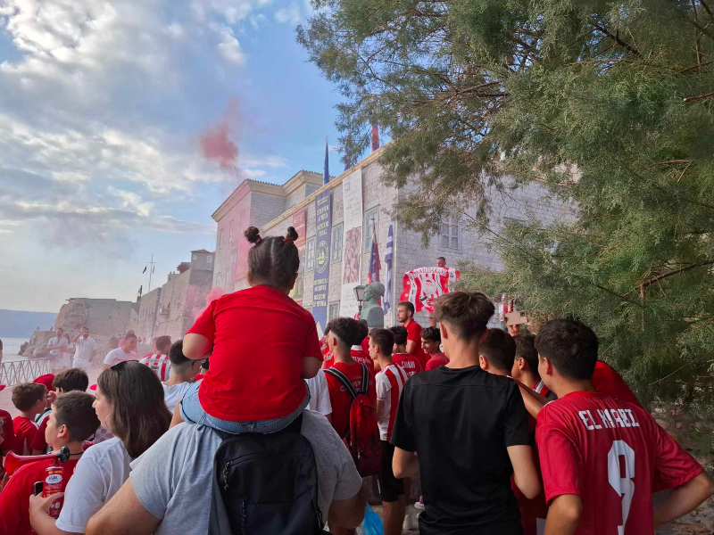 Εκατοντάδες φίλοι του Ολυμπιακού κατέκλυσαν το λιμάνι της Ύδρας, συγκεντρωμένοι κάτω από την Ακαδημία Εμπορικού Ναυτικού, για να υποδεχτούν την βαρύτιμη ευρωκούπα του Conference League, που έφερε περήφανα στο νησί η αγαπημένη τους ομάδα.