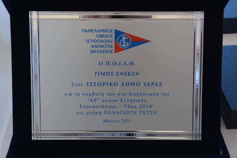 Στην εκδήλωση που πραγματοποιήθηκε ο Δήμαρχος Ύδρας Γιώργος Κουκουδάκης, έκανε χαιρετισμό και εξέφρασε την αποδοχή του αγώνα από την τοπική κοινωνία, ενός αγώνα που διοργανώνεται από το 1973 και δώρισε στον Πρόεδρο του ΠΟΙΑΘ Ιωάννη Μαραγκουδάκη την τιμητική πλακέτα του Δήμου. Από την πλευρά του Πρόεδρος του ΠΟΙΑΘ, ευχαριστώντας τον Δήμο για την πολύτιμη συνεργασία επέδωσε στον Δήμαρχο τιμητική πλακέτα του Ομίλου τους. Στη συνέχεια ο κ. Μαραγκουδάκης δώρισε τιμητική πλακέτα στον Υδραϊκό Ναυτικό Όμιλο που είναι ο φιλοξενών Όμιλος, την οποία παρέλαβε η Γραμματέας του Ομίλου Αναστασία Μαυρομάτη. Επίσης δόθηκε τιμητική πλακέτα στον Λιμενάρχη Ύδρας για τη βοήθεια στον ελλιμενισμό των σκαφών. Ακολούθησαν οι βραβεύσεις των πληρωμάτων στις κατηγορίες ORCi, IRC, ORC Club, ORC Club/F. Την εκδήλωση συντόνισε το μέλος του Υδραϊκού Ναυτικού Ομίλου, Εμμανουήλ Πούλος καλωσορίζοντας τα πληρώματα των αγώνων.