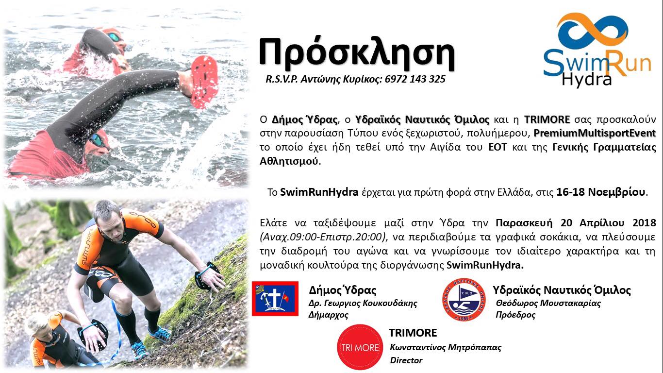 Παρουσίαση Τύπου για τους αγώνες SwinRun Hydra θα πραγματοποιηθεί στην Ύδρα, την Παρασκευή 20 Απριλίου και ώρα 11.00 το πρωί στην αίθουσα του δημοτικού συμβουλίου.