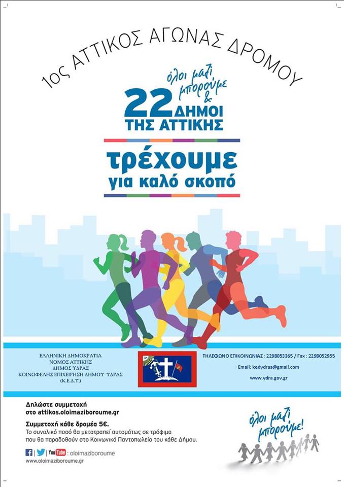 Στον 1ο Αττικό Αγώνα Δρόμου, στο πλαίσιο της πρωτοβουλίας του ΣΚΑΙ, "Όλοι μαζί Μπορούμε", συμμετέχει ο Δήμος Ύδρας στις 20 Μαΐου 2018.