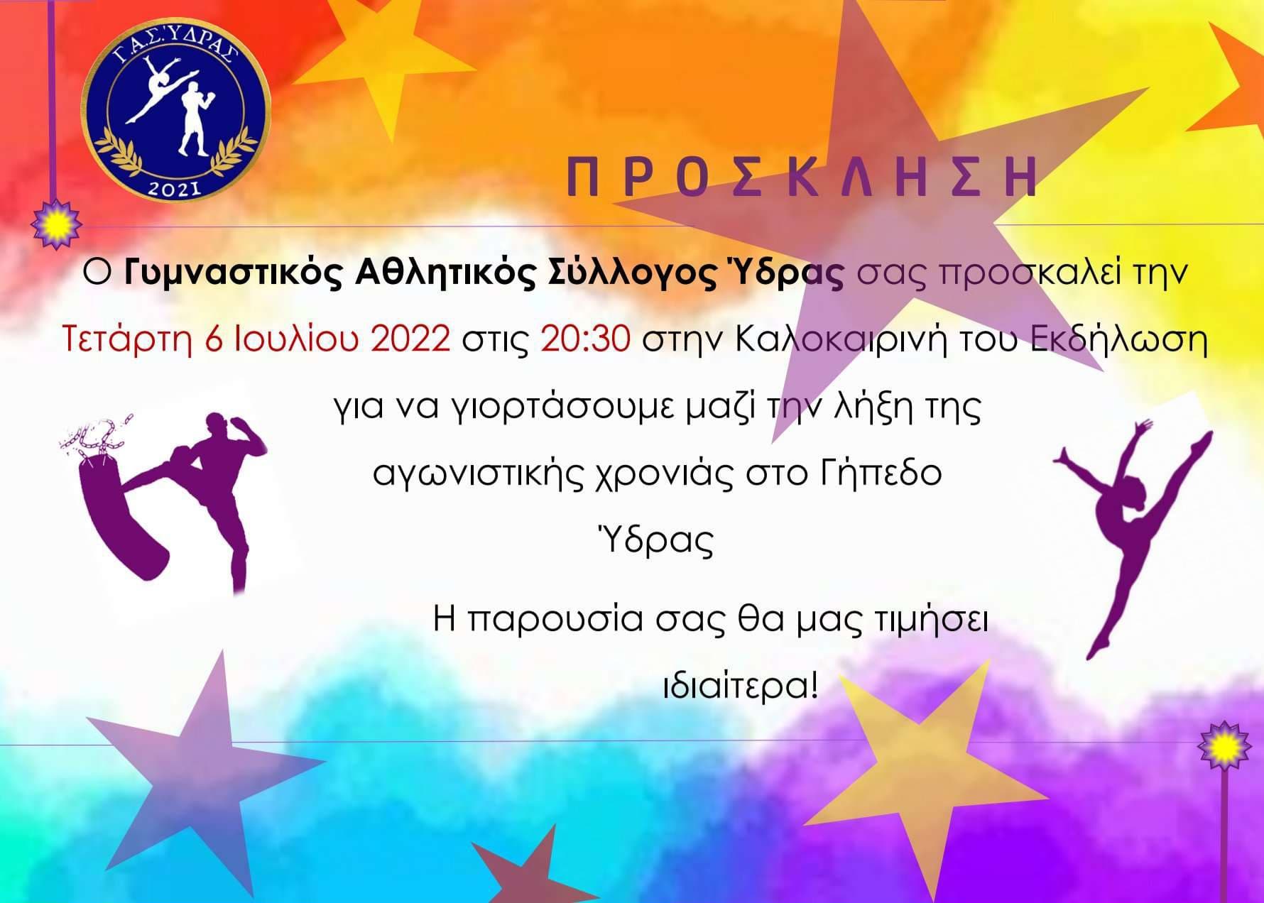 Ο Γυμναστικός Αθλητικός Σύλλογος Ύδρας προσκαλεί στην 1η αθλητική γιορτή του συλλόγου που θα γίνει την Τετάρτη 6 Ιουλίου και ώρα 20:30 στο γήπεδο Ύδρας!
