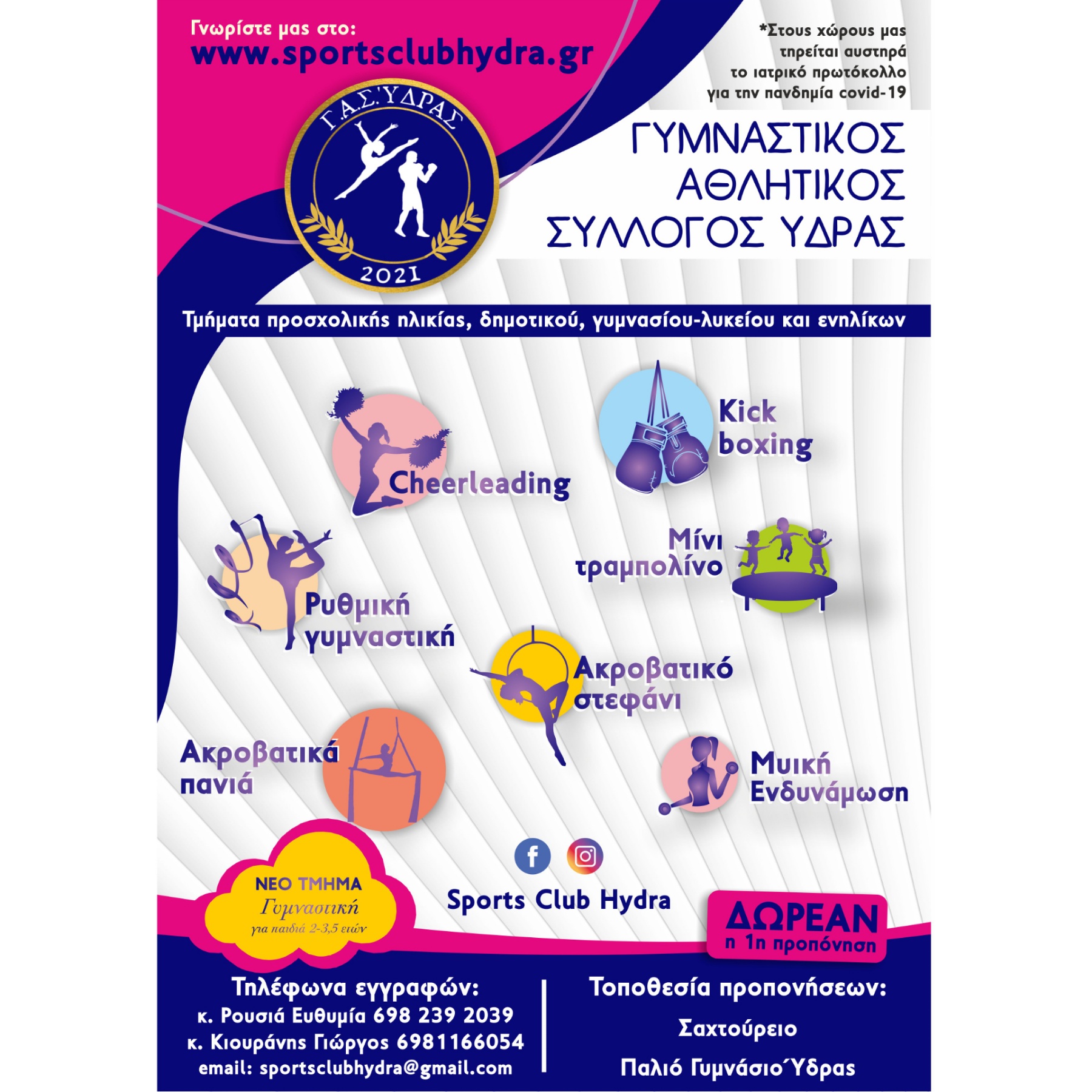 Για πληροφορίες και εγγραφές μπορείτε να απευθυνθείτε στα τηλέφωνα 6982392039 κ. Ρουσιά Ευθυμία και 6981166054 κ. Κιουράνης Γιώργος καθώς και στο email του συλλόγου sportsclubhydra@gmail.com και στο επίσημο site του συλλόγου www.sportsclubhydra.gr από 22/8/22.