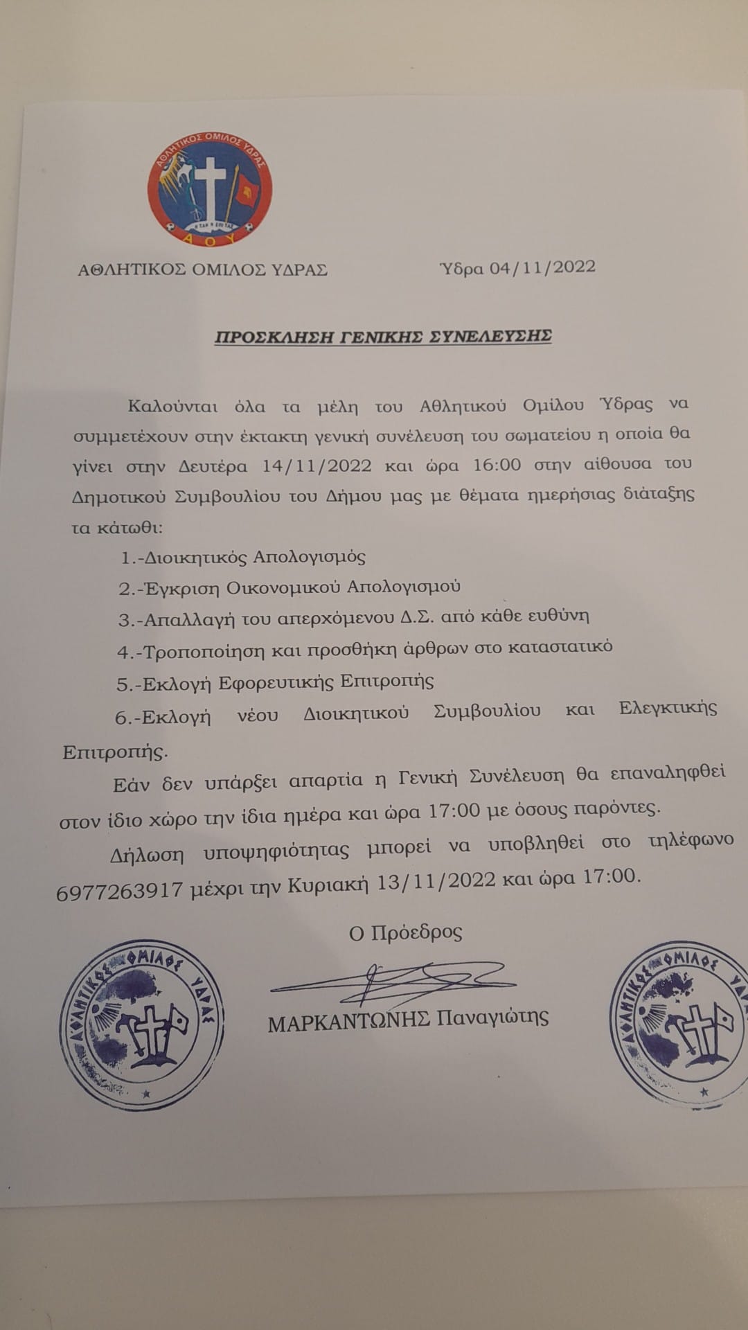 Έκτακτη γενική συνέλευση θα πραγματοποιήσει την Δευτέρα 14 Νοεμβρίου και ώρα 16:00 στην αίθουσα του Δημοτικού Συμβουλίου ο Αθλητικός Όμιλος Ύδρας προκειμένου να εγκλεγεί νέο διοικητικό συμβούλιο και να συζητηθούν και άλλα θέματα.