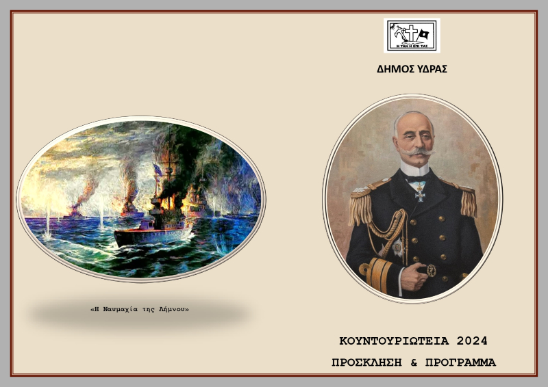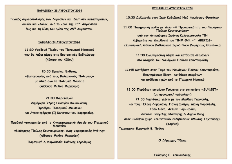 Τιμώντας τον πρώτο Πρόεδρο της Ελληνικής Δημοκρατίας, Ναύαρχο Παύλο Κουντουριώτη, ο Δήμος Ύδρας πραγματοποιεί τις εορταστικές εκδηλώσεις "Κουντουριώτεια 2024", από τις 23 μέχρι τις 25 Αυγούστου.