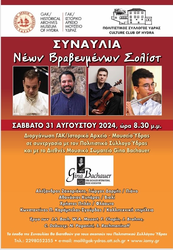 CONCERT OF YOUNG AWARD-WINNING SOLOISTS AT THE GAK/HISTORICAL ARCHIVES – MUSEUM OF HYDRA IN COLLABORATION WITH THE CULTURAL CLUB OF HYDRA AND THE INTERNATIONAL MUSIC ASSOCIATION "GINA BACHAUER"