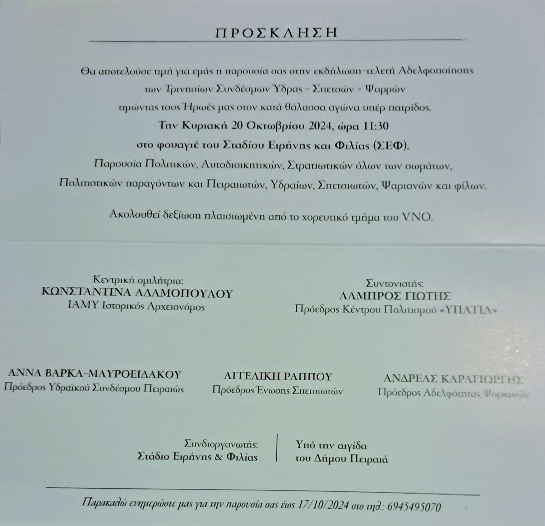 Η Πρόεδρος Άννα Βάρκα Μαυροειδάκου και το Δ.Σ. του Ιστορικού Υδραϊκού Συνδέσμου Πειραιώς καλούν τα ΜΕΛΗ του ΥΣΠ να συμμετέχουν στην εκδήλωση Αδελφοποίησης Τρινησίων Συνδέσμων ΥΔΡΑ ΣΠΕΤΣΕΣ ΨΑΡΑ, που θα γίνει στο Φουαγιέ του Σταδίου Ειρήνης και Φιλίας την Κυριακή 20 Οκτωβρίου και ώρα προσέλευσης 11.30π.μ,.παρουσία Πολιτικών, Αυτοδιοικητικών, Στρατιωτικών αρχών και Πολιτιστικών Σωματείων.