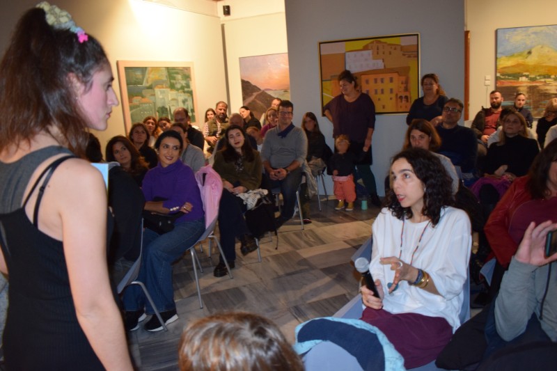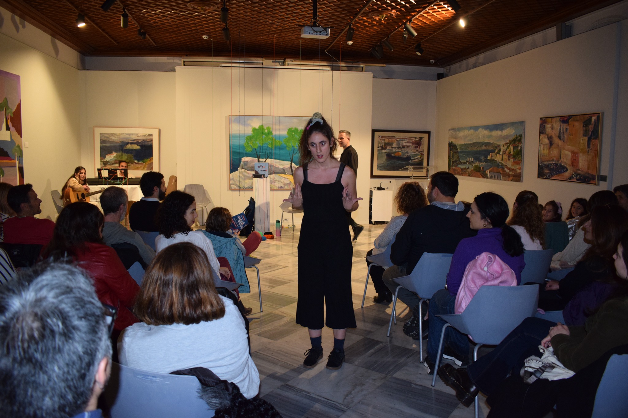 Με μια αληθινή και εντυπωσιακή θεατρική performance ο συγγραφέας διαβάζοντας επιλεγμένα αποσπάσματα του βιβλίου του αλλά και τραγουδώντας υπέροχα τα θέματα της συγγραφής του, μας αφηγήθηκε την περιπέτεια της ατίθασης τρίχας Τερέζας και της μικρής αλλά δημιουργικής και δοτικής Γραμμής, με την εντυπωσιακή συμμετοχή της ηθοποιού Γαρυφαλλιάς Μαρίνη αλλά και τις μουσικές μελωδίες του Σπύρου (πιάνο) και της Σοφίας (κιθάρα) Αργυρού.