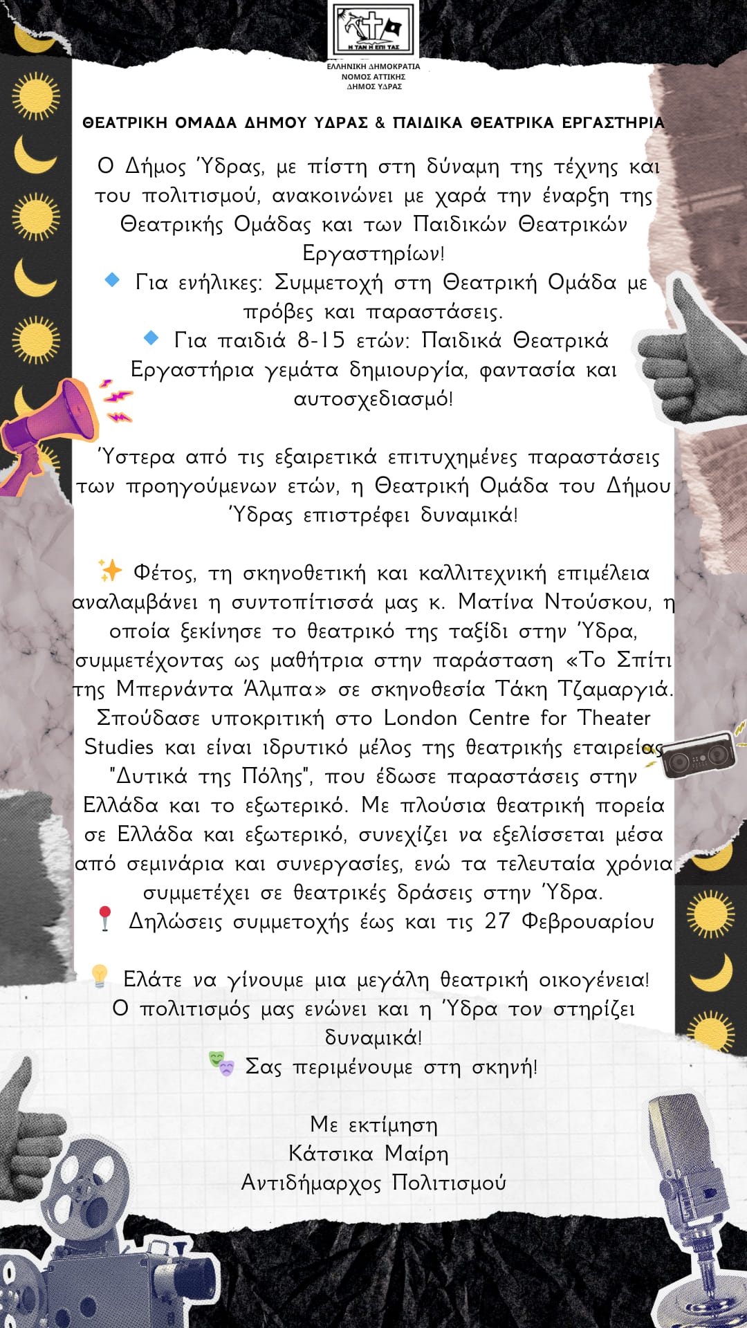 Ο Δήμος Ύδρας, όπως μας ενημερώνει η Αντιδήμαρχος Πολιτισμού κ. Μαίρη Κάτσικα, στηρίζοντας ενεργά την τέχνη και τον πολιτισμό, ανοίγει και πάλι τη θεατρική αυλαία, καλώντας μικρούς και μεγάλους να γίνουν μέρος μιας μοναδικής εμπειρίας!