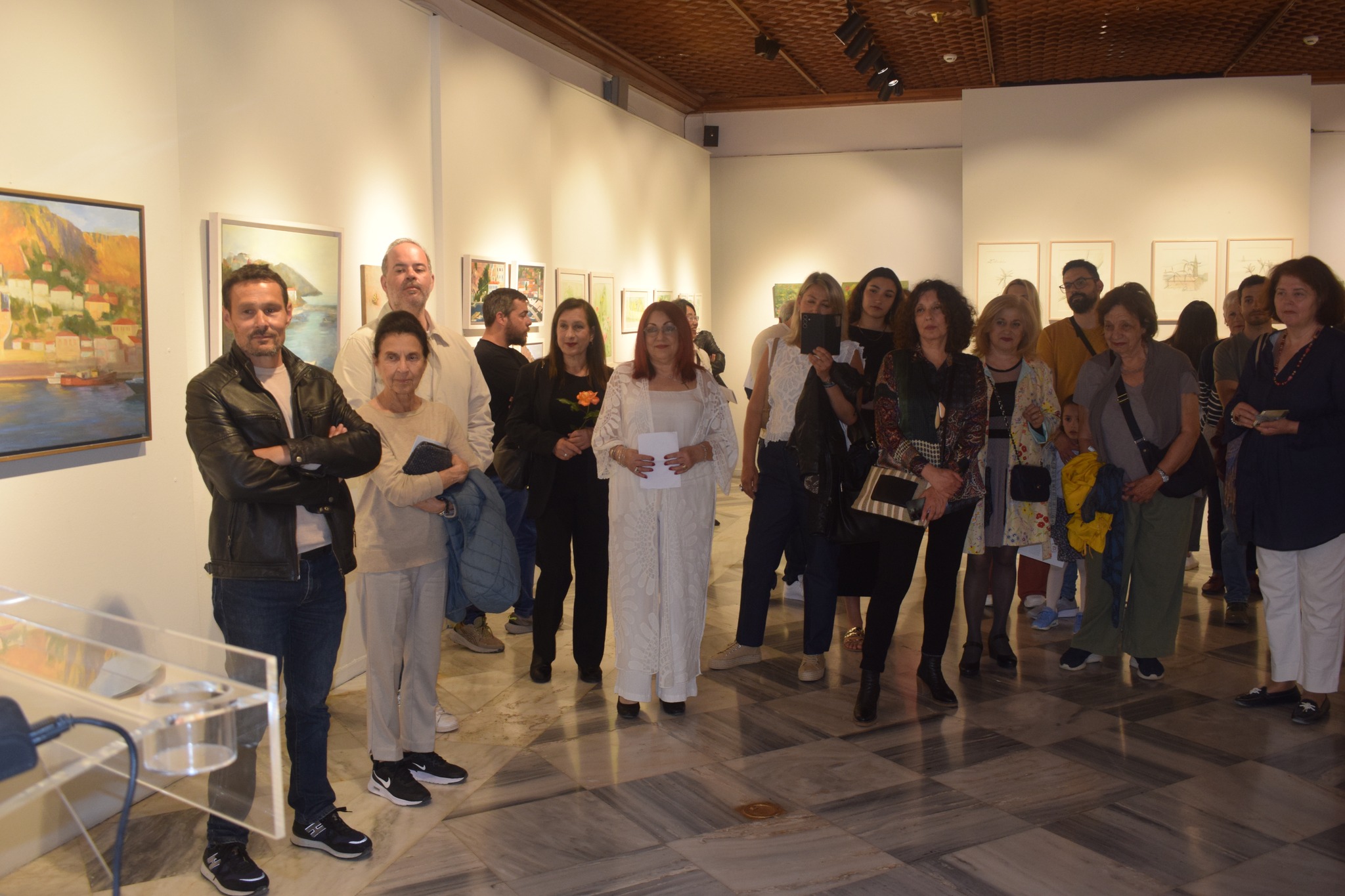 Υποδεχόμενη το εκλεκτό κοινό, η κ. Ντίνα Αδαμοπούλου, ευχαρίστησε όλες και όλους για την παρουσία τους στην έκθεση και στη συνέχεια αναφέρθηκε στους καλλιτέχνες της έκθεσης οι οποίοι «… από διαφορετικά σημεία και με διαφορετικές αφηγήσεις, συναντιούνται εδώ, με κοινό σημείο αναφοράς την Ύδρα, για να μιλήσουν μέσα από το έργο τους για τον χρόνο, τη μνήμη, τη θάλασσα και την αίσθηση του ανήκειν. Η Ύδρα δεν είναι απλώς ένα φόντο. Είναι μία πρωταγωνίστρια !! Είναι ο χώρος που διαμορφώνει και εμπνέει, με την ιστορία της, την αρχιτεκτονική της, τη γεωγραφία της. Τα σοκάκια της, η σιωπή των δρόμων, η θάλασσα, τα πέτρινα σπίτια της, το υπέροχο φως της – όλα λειτουργούν ως ενεργά στοιχεία στη συνάντηση των οκτώ αυτών καλλιτεχνών και του κοινού…», όπως ανέφερε χαρακτηριστικά.