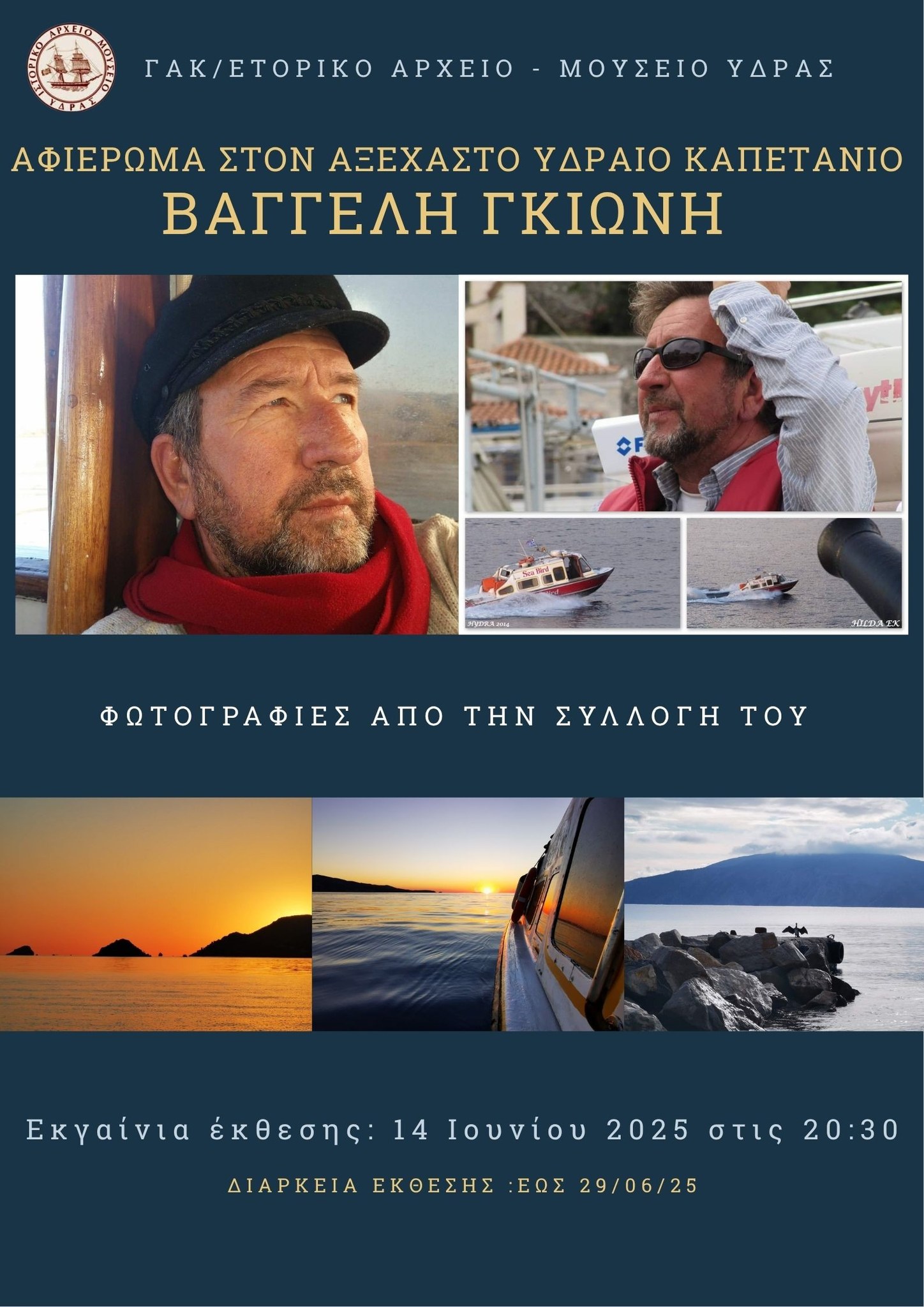 Έκθεση φωτογραφίας - αφιέρωμα στον αείμνηστο Υδραίο καπετάνιο Βαγγέλη Γκιώνη με φωτογραφίες από τη συλλογή του, θα πραγματοποιηθεί στο Ιστορικό Αρχείο Μουσείο Ύδρας.