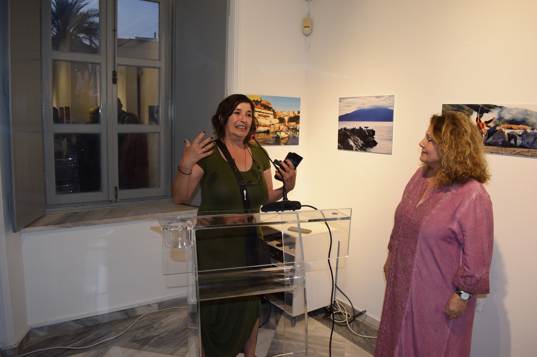 Υποδεχόμενη το εκλεκτό κοινό συμπατριωτών και φίλων, η Πρόεδρος του Φ. Διαχ. του Ιστορικού Αρχείου – Μουσείου Ύδρας, Ντίνα Αδαμοπούλου, ευχαρίστησε όλες και όλους για την παρουσία τους στα εγκαίνια της έκθεσης και έδωσε πρώτα τον λόγο στην σύζυγο του Βαγγέλη Γκιώνη κ. Ντίνα Φουρτούνη-Γκιώνη η οποία απευθύνοντας λόγω εξαιρετικής συγκίνησης μερικά μόνο (υπέροχα όμως ) λόγια ευχαρίστησε την Ντίνα Αδαμοπούλου και το ΙΑΜΥ για την εξαιρετική τους συνεργασία και κλείνοντας θύμισε στο κοινό τα γνώριμα λόγια του Βαγγέλη : «… Οι δύο Ντίνες της Ύδρας…».