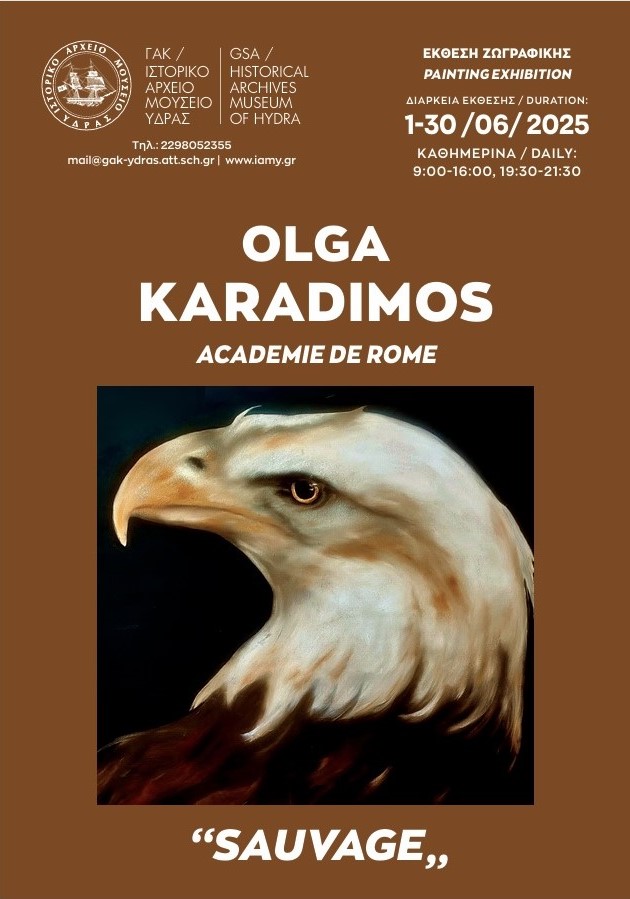 Το ΓΑΚ/ΙΣΤΟΡΙΚΟ ΑΡΧΕΙΟ - ΜΟΥΣΕΙΟ ΥΔΡΑΣ θα πραγματοποιήσει την Παρασκευή 20 Ιουνίου και ώρα 9μ.μ. τα εγκαίνια της έκθεσης ζωγραφικής με τίτλο "SAUVAGE" της εικαστικού OLGA KARADIMOS.