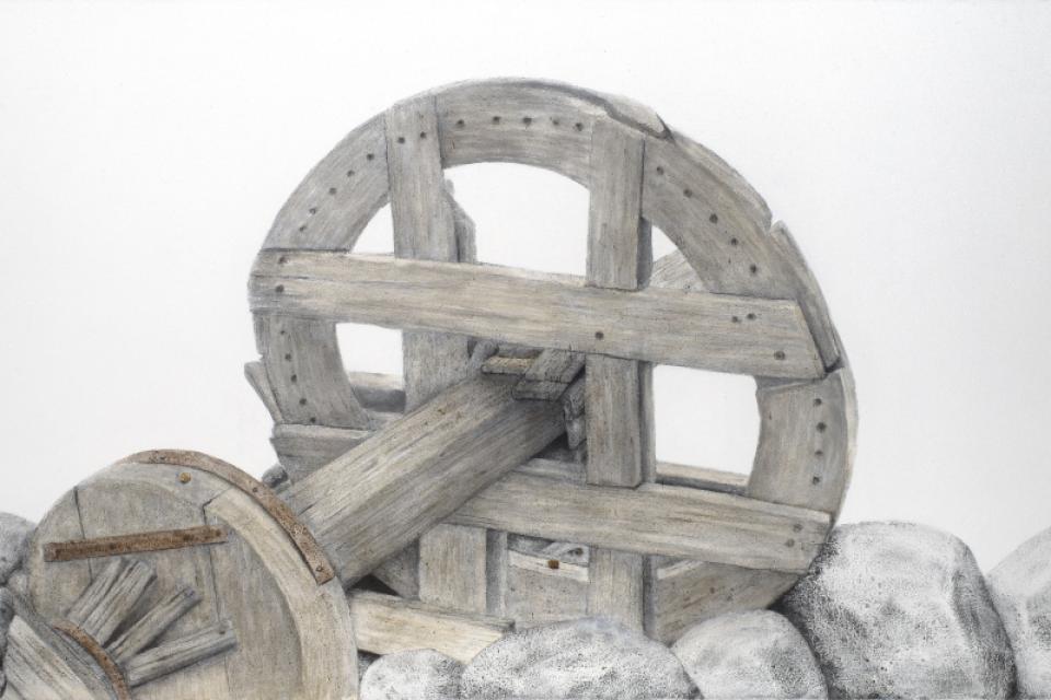 Ο ζωγράφος και Δάσκαλος της Σχολής Αρχιτεκτόνων του Ε.Μ. Πολυτεχνείου παρουσιάζει μια σειρά έργων που αποτυπώνουν ερείπια ανεμόμυλων και θαλασσινών ξύλων από βάρκες, καΐκια και σκουριές.