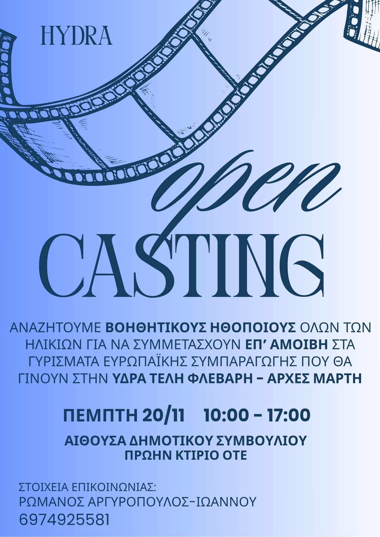 Ο Δήμος Ύδρας ενημερώνει ότι κινηματογραφική παραγωγή ευρωπαϊκής συμπαραγωγής, η οποία θα πραγματοποιηθεί στο νησί μας τον χειμώνα, αναζητά βοηθητικούς ηθοποιούς όλων των ηλικιών, με αμοιβή, για συμμετοχή στα γυρίσματα που θα λάβουν χώρα τέλη Φεβρουαρίου, αρχές Μαρτίου.