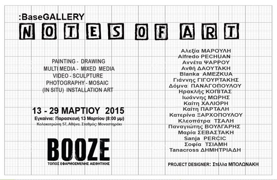 Από τις 13 Μαρτίου και έως τις 29 Μαρτίου 2015, η εγκατάσταση των δειγμάτων Νερού του World Water Museum θα εκτίθεται στην ομαδική έκθεση "Notes of Art" στην Base GALLERY του BOOZE,