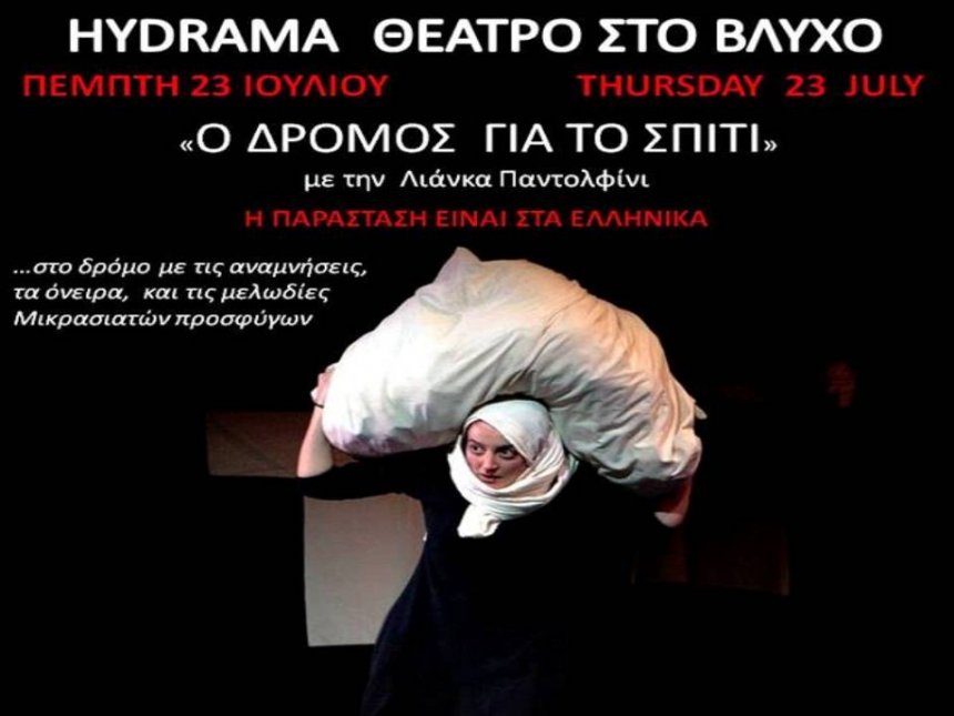 Σήμερα το βράδυ στις 9:15 θα παρουσιαστεί στο Hydrama Θέατρο του Βλυχού η παράσταση "Ο Δρόμος για το σπίτι". Μια παράσταση στα ελληνικά για την ταυτότητα και την προσφυγιά ... Στη σιωπηλή γωνιά ενός σπιτιού είναι καθισμένη μια γριά γυναίκα. Μια παλιά μελωδία την επισκέπτεται ξυπνώντας μέσα της θύμησες από τα παιδικά της χρόνια και ταξιδεύει προς τα μέρη όπου γεννήθηκε, κάπου στην Ανατολή, στις αρχές του περασμένου αιώνα. Λαχταρά να μπει στο σπίτι που γεννήθηκε, όμως ένας φόβος βαθύς αναδύεται: το φάντασμα του ξεριζωμού της. Οι αναμνήσεις μπλέκονται με τα όνειρά της κι εκείνη σταδιακά αποκαλύπτει την ιστορία της και αναμετράται με τις κομμένες ρίζες της, σε μια τελευταία προσπάθεια να βρει το δρόμο για το σπίτι... Αυτή είναι η ιστορία που μας παρουσιάzει στο HYDRAMA η Λιάνκα Παντολφίνι. Μια ιστορία για την ταυτότητα και την απώλεια της ρίζας του πρόσφυγα, την οποία θα μας εξιστορήσει με τη βοήθεια μιας κούκλας, μέσω της κίνησης, της εικόνας, του τραγουδιού και της αφήγησης. Διάρκεια έργου 60'.