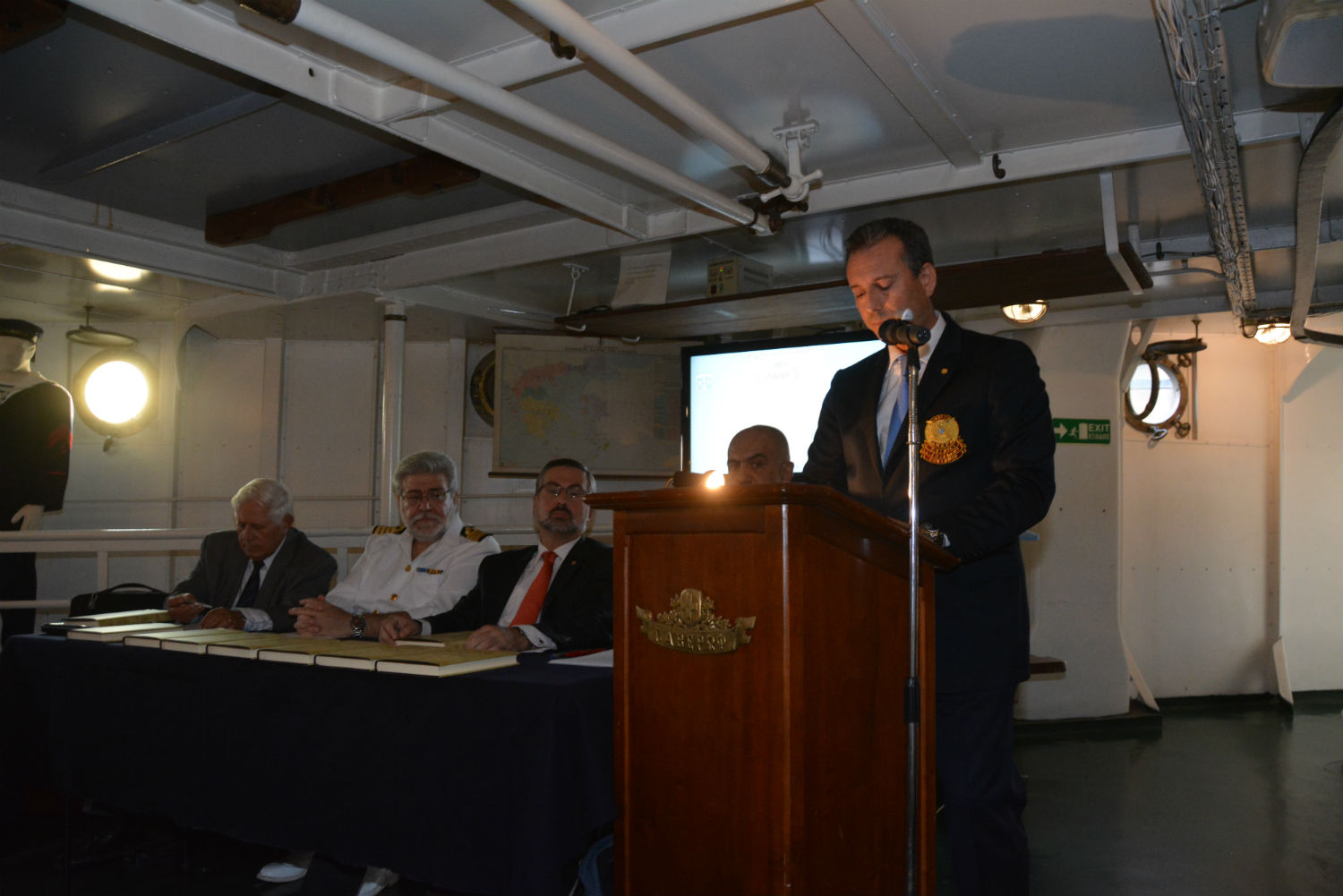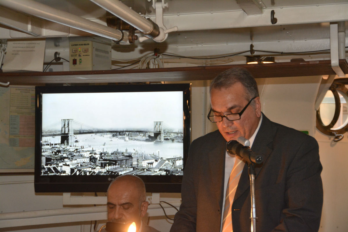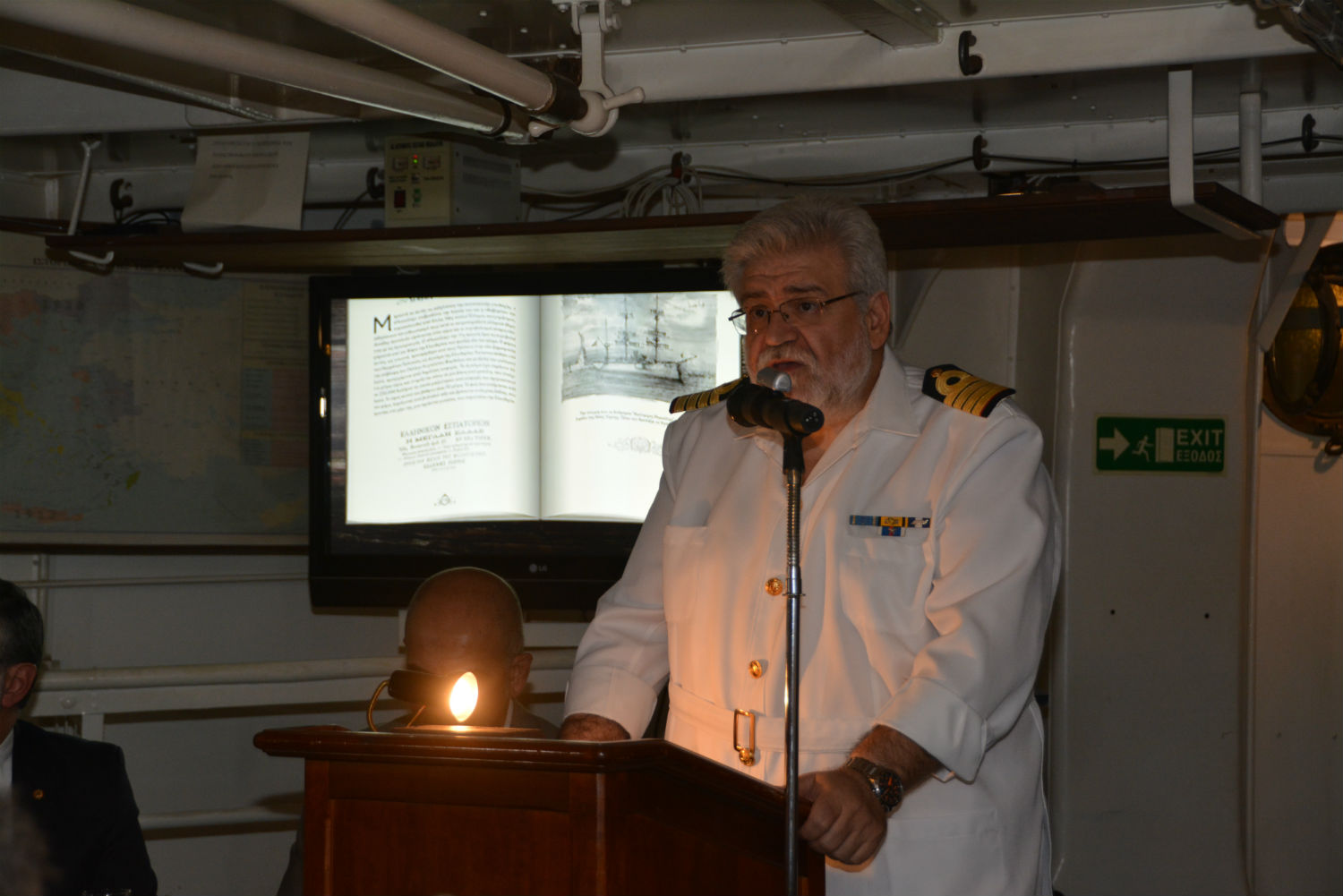 Στην εκδήλωση χαιρετισμό και καλωσόρισμα απεύθυνε ο Κυβερνήτης του Θ/Κ «Γ. ΑΒΕΡΩΦ», Πλοίαρχος Σωτήριος Χαραλαμπόπουλος, ο Διευθυντής της Υδρογραφικής Υπηρεσίας του Π.Ν. Πλοίαρχος Δημήτρης Ευαγγελίδης και οι συγγραφείς Στέφανος Μίλεσης και Παναγιώτης Τριπόντικας.