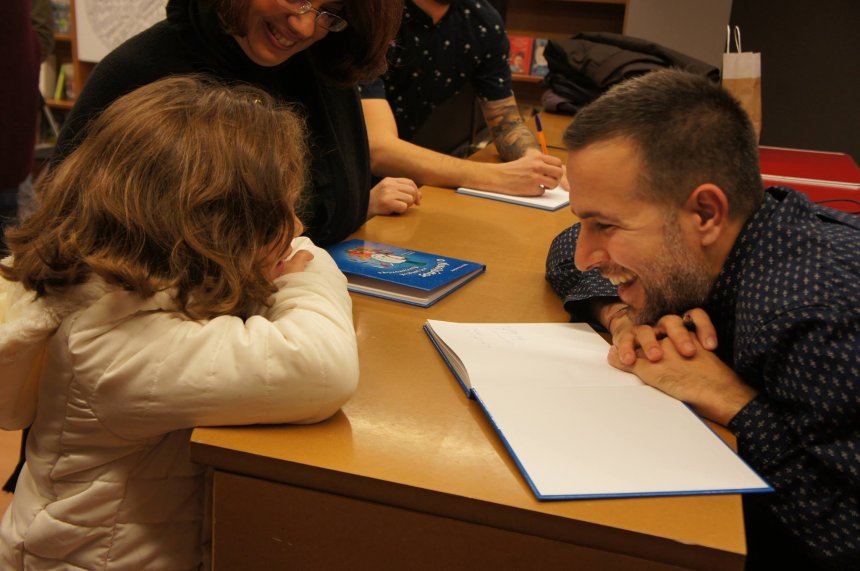 Ο χρόνος κυλούσε γρήγορα... Ανάμεσα σε αγκαλιές, σε υπογραφές, σε αφιερώσεις, σε φωτογραφίες, σε ανταλλαγή ενέργειας και πολύ αγάπης, μας ενημερώνουν ότι η ώρα έχει πάει ήδη επτά και είκοσι, οι καρέκλες έχουν ήδη γεμίσει και εμείς, μαζί με τον φίλο και εικονογράφο του Νικολύκου, Γιάννη Ζαμπέλη, έπρεπε να ξεκινήσουμε την παρουσίαση.
