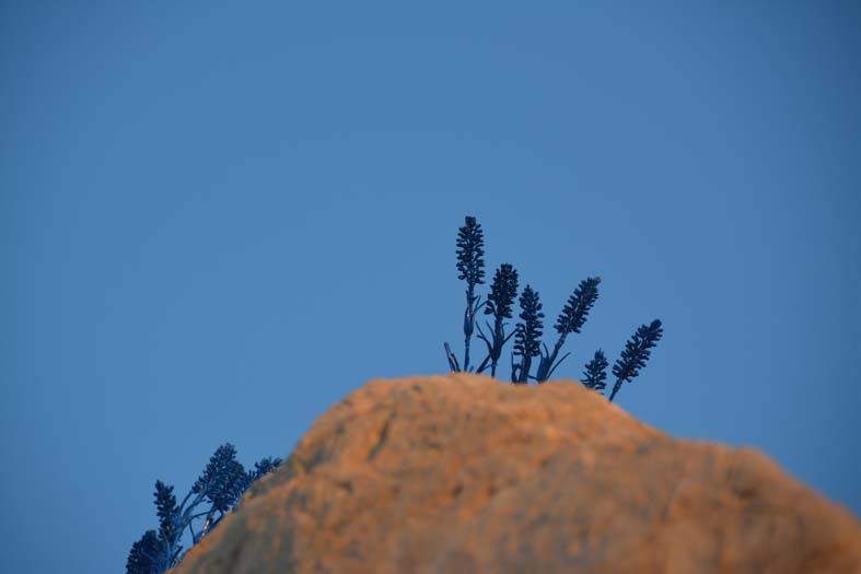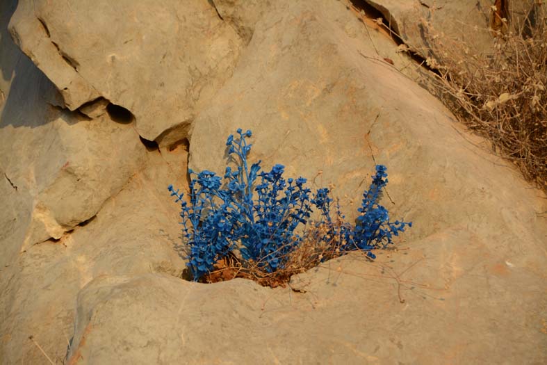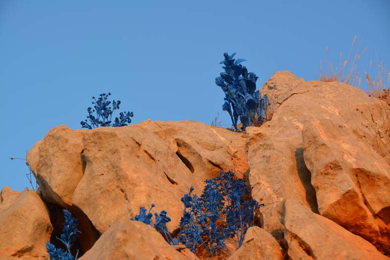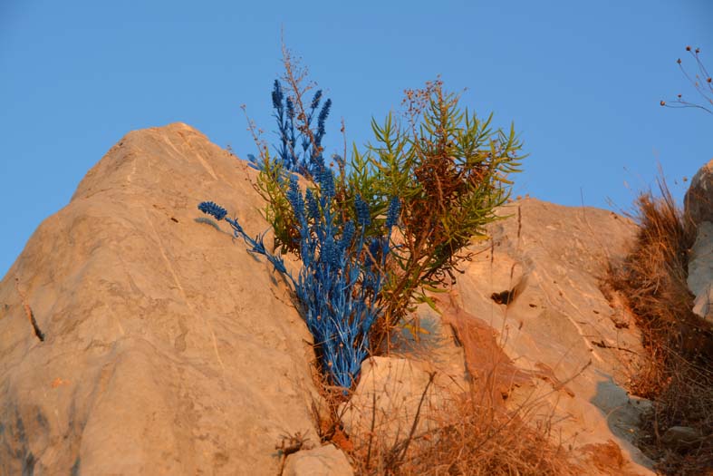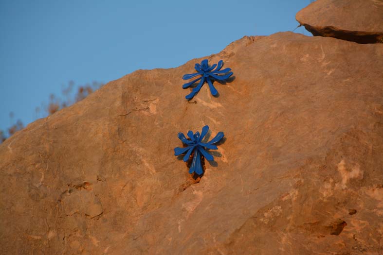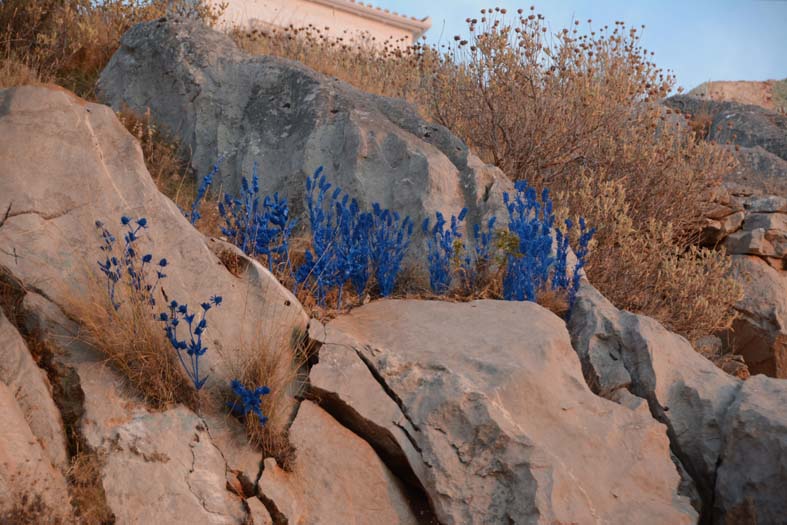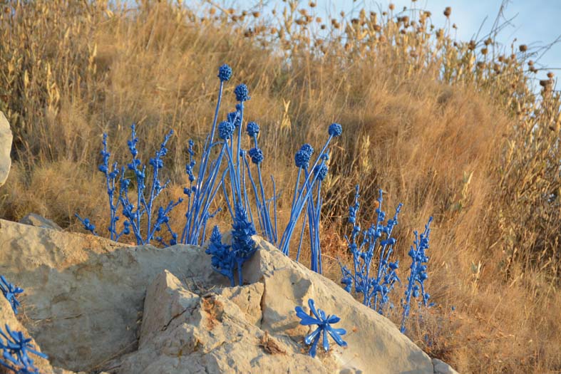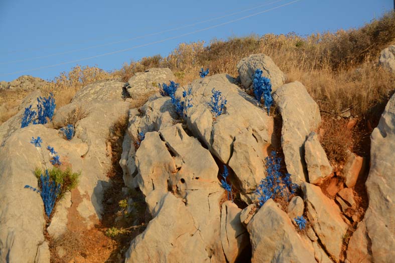 Κάτι σαν όνειρο μοιάζει, η εγκατάσταση της Μαρίας Τσάγκαρη, στους βράχους, στον δρόμο για τον Μανδράκι, μόλις στρίβει κανείς από το κάστρο του Μιαούλη. Τα μπλε λουλούδια της, ριζωμένα στους βράχους και τον χρόνο, μοιάζουν να καταργούν τη βεβαιότητά μας για την πράσινη φύση και να ανοίγουν επαναστατικό διάλογο με όσα θεωρούμε δεδομένα.