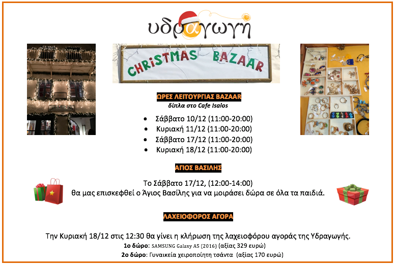 Για άλλη μια χρονιά η Υδραγωγή οργανώνει χριστουγεννιάτικο Bazaar με δημιουργίες παιδιών και πρωτότυπα δώρα, (ημερολόγια, τσάντες, καπέλα, κοσμήματα, μπρελόκ, βιβλία, ποδιές, κούπες, γούρια για το νέο έτος).
