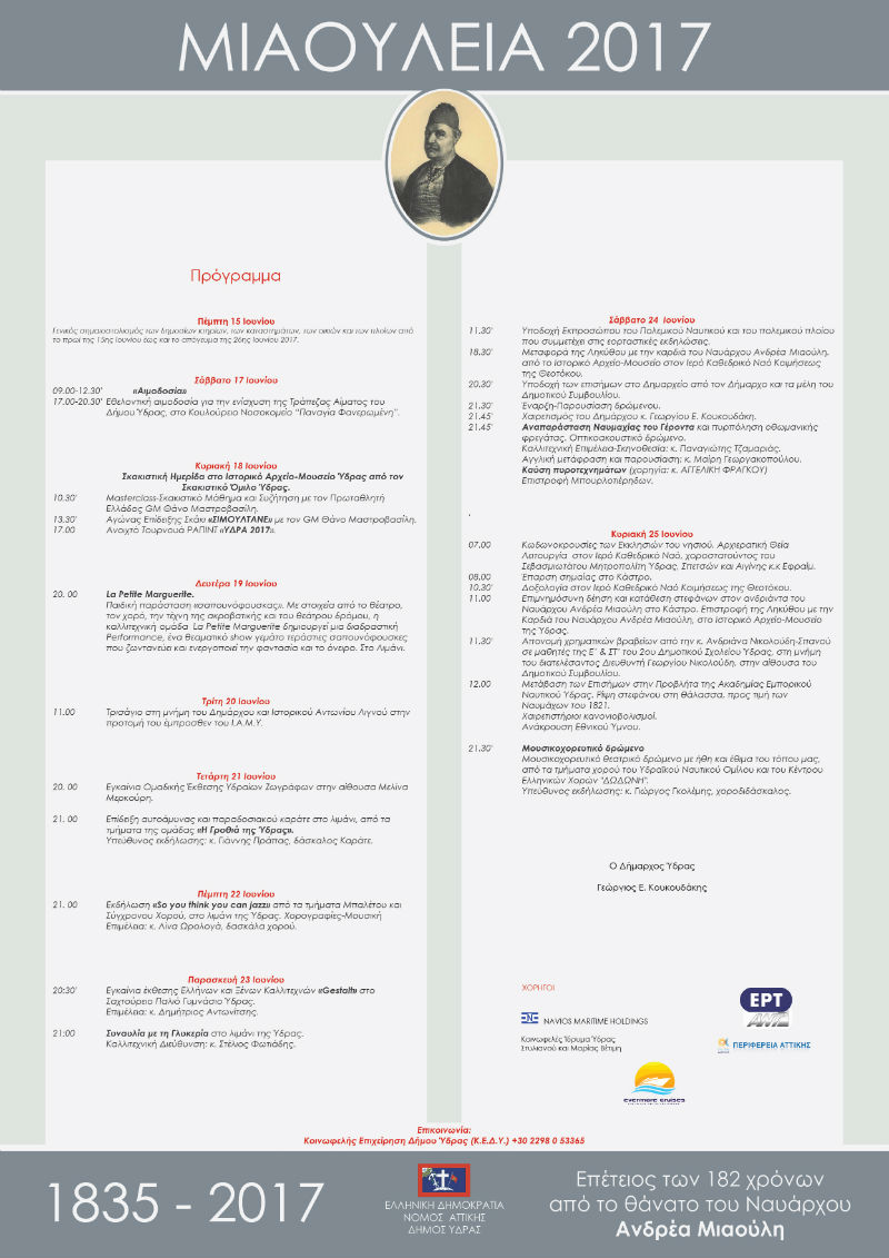 Aρχίζει στις 15 Ιουνίου στην Ύδρα ένα δεκαήμερο εορταστικών εκδηλώσεων υπό την αιγίδα του Δήμου Ύδρας, προς τιμήν του μεγάλου τέκνου του νησιού Ανδρέα Μιαούλη, του ναυάρχου του ελληνικού στόλου στην διάρκεια του Απελευθερωτικού Αγώνα του 1821, που η επιτυχής του έκβαση, οδήγησε στην δημιουργία του σύγχρονου Ελληνικού Κράτους. Μαζί με τον Μιαούλη η Ύδρα τιμά και δεκάδες άλλα παιδιά της, ναυμάχους, πλοιοκτήτες-καπεταναίους, μπουρλοτιέρηδες και απλούς ναύτες που πολέμησαν και αρκετοί από αυτούς έδωσαν τη ζωή τους για τον μεγάλο σκοπό.
