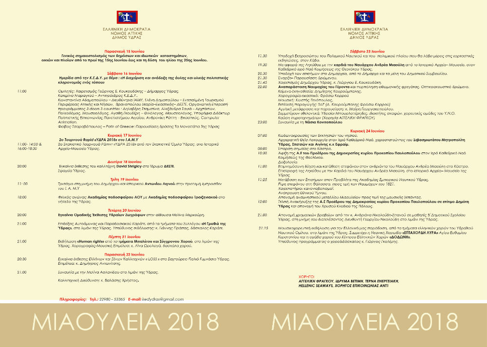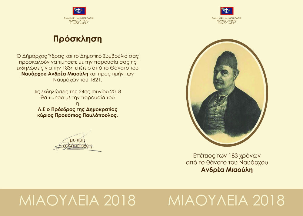 Ξεκινά στις 15 Ιουνίου στην Ύδρα ένα δεκαήμερο εορταστικών εκδηλώσεων υπό την αιγίδα του Δήμου Ύδρας, προς τιμήν του μεγάλου τέκνου του νησιού Ανδρέα Μιαούλη, του ναυάρχου του ελληνικού στόλου στην διάρκεια του Απελευθερωτικού Αγώνα του 1821, που η επιτυχής του έκβαση, οδήγησε στη δημιουργία του σύγχρονου Ελληνικού Κράτους.