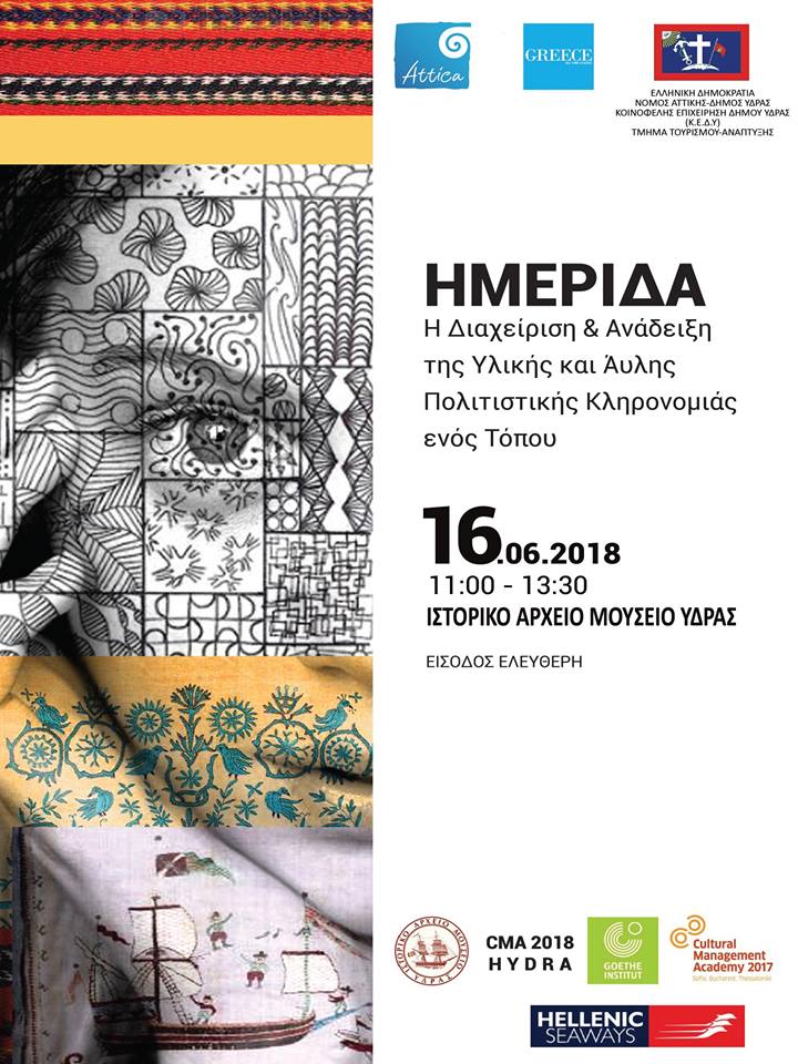 Η Κοινωφελής Επιχείρηση Δήμου Ύδρας και η Ακαδημία Πολιτιστικής Διαχείρισης Θεσσαλονίκη, Σόφια, Βουκουρέστι 2017, διοργανώνουν το Σάββατο 16 Ιουνίου, ώρα 11:00 Ημερίδα Διαχείρισης και Ανάδειξης της υλικής και άυλης κληρονομιάς ενός τόπου, η οποία θα υλοποιηθεί στο Ιστορικό Αρχείο-Μουσείο Ύδρας.