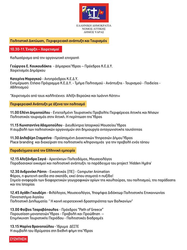 Συγκεκριμένα, στην Ημερίδα χαιρετισμό θα απευθύνουν ο Γεώργιος Κουκουδάκης, Δήμαρχος Ύδρας και Πρόεδρος ΚΕΔΥ και η Κατερίνα Μαραγκού, Αντιπρόεδρος ΚΕΔΥ και θα γίνει καλωσόρισμα από την Οργανωτική Επιτροπή του προγράμματος “3 doors-3 countries” της Διαβαλκανικής Ακαδημίας Πολιτιστικής Διαχείρισης 2017.