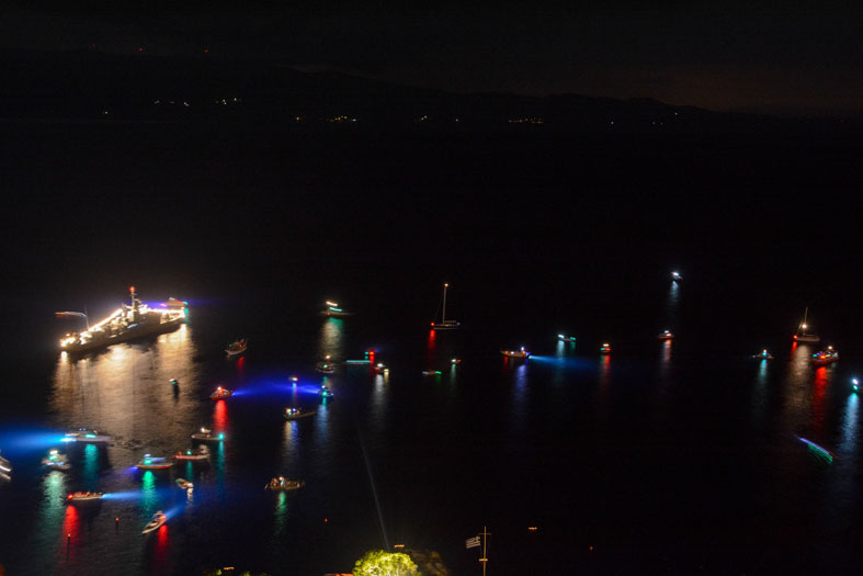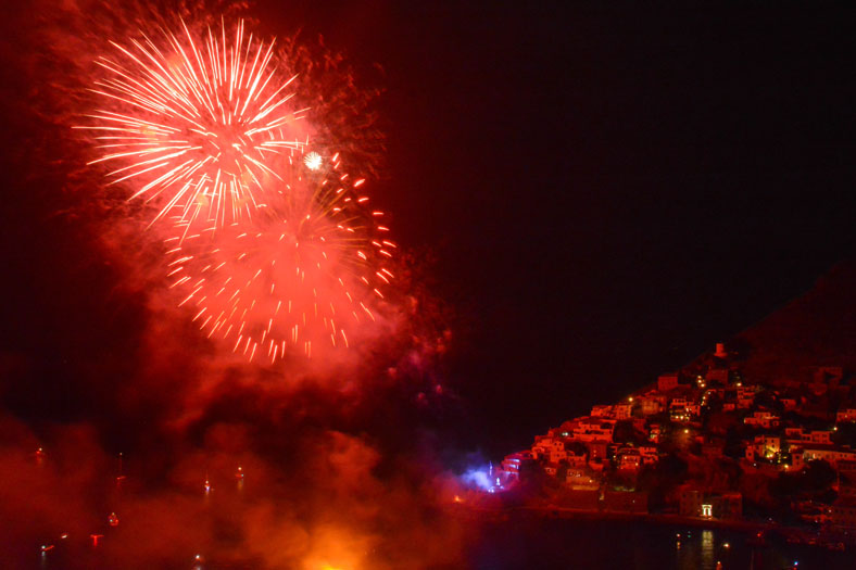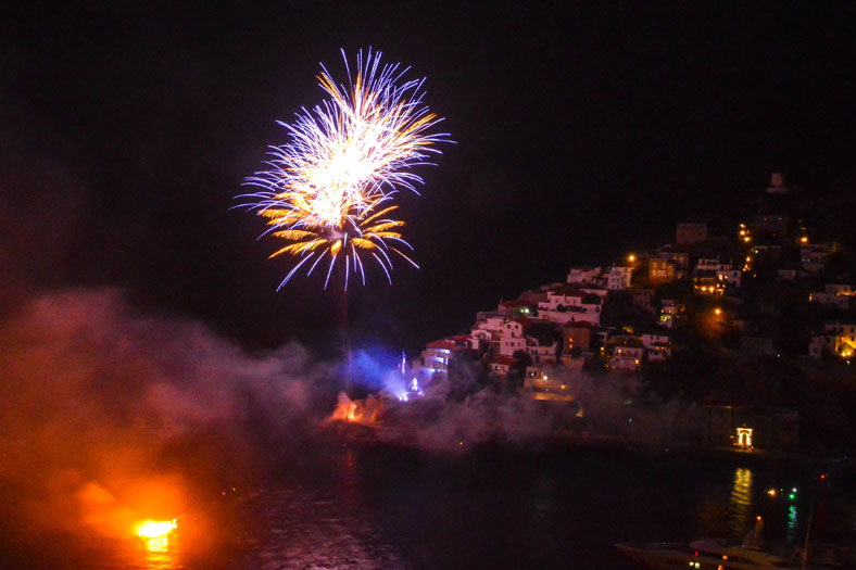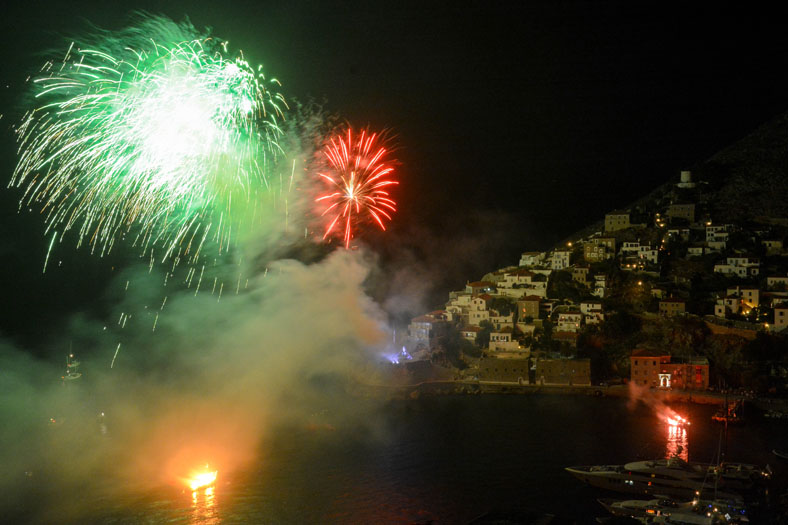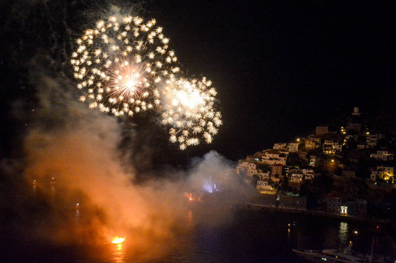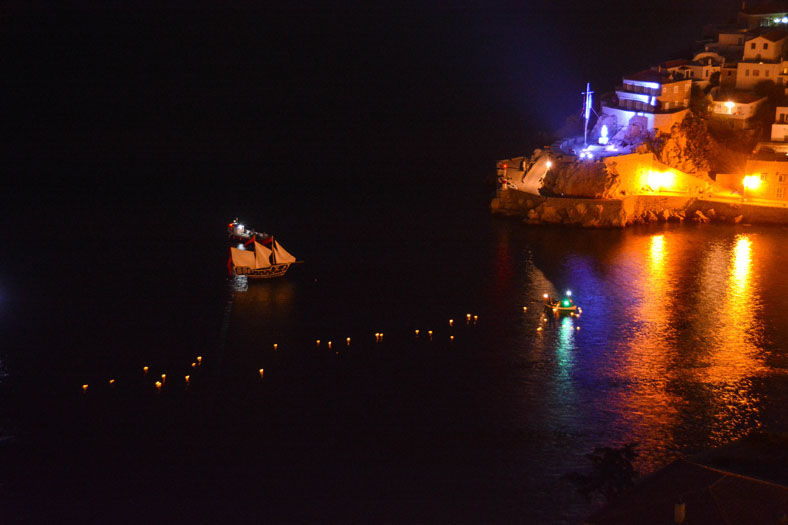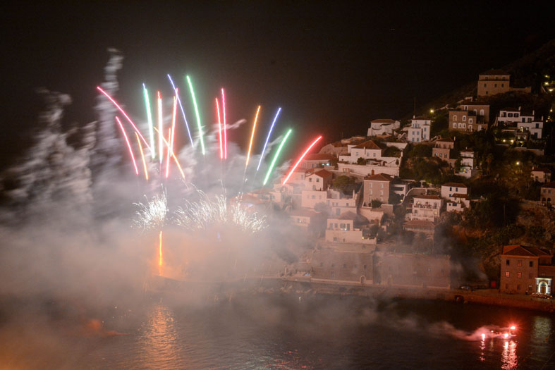 Πλήθος κόσμου παρακολούθησε με ενδιαφέρον και θαυμασμό το δρώμενο που εκτυλίχθηκε στο λιμάνι της Ύδρας με θεατρική αφήγηση, φαναράκια να πλέουν στη θάλασσα, εντυπωσιακά πυροτεχνήματα να φωτίζουν τον ουρανό.