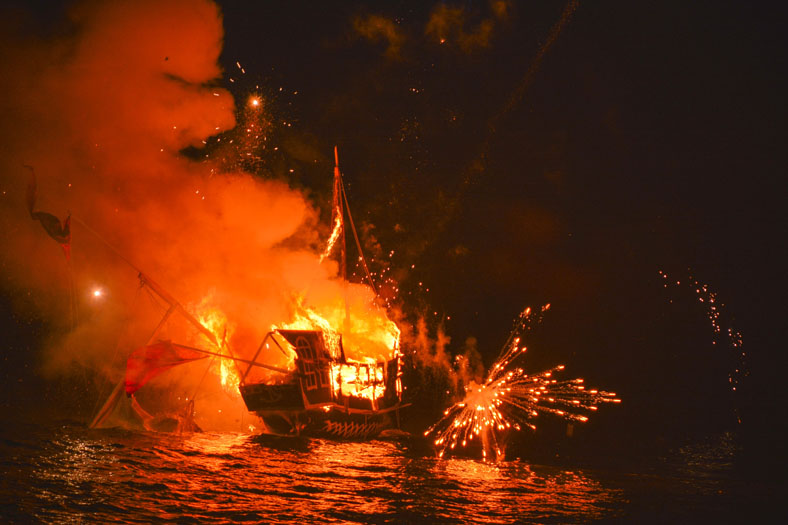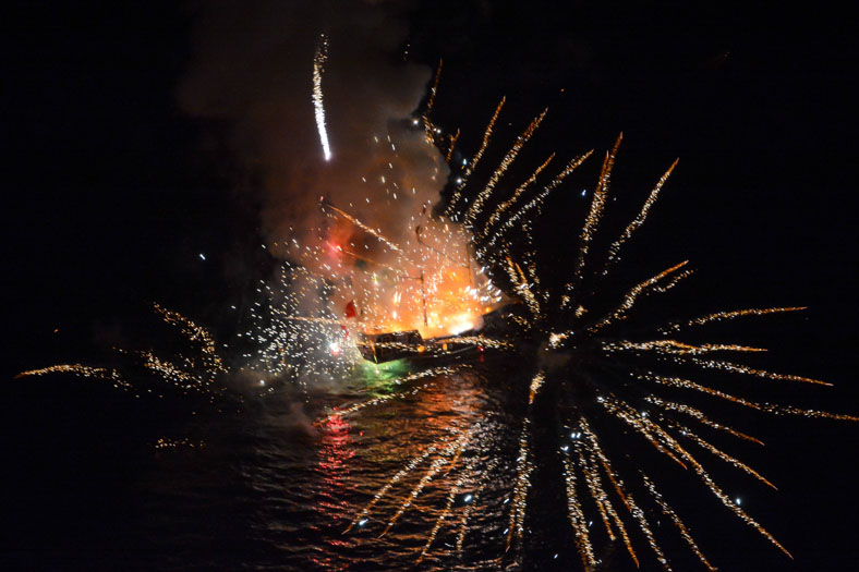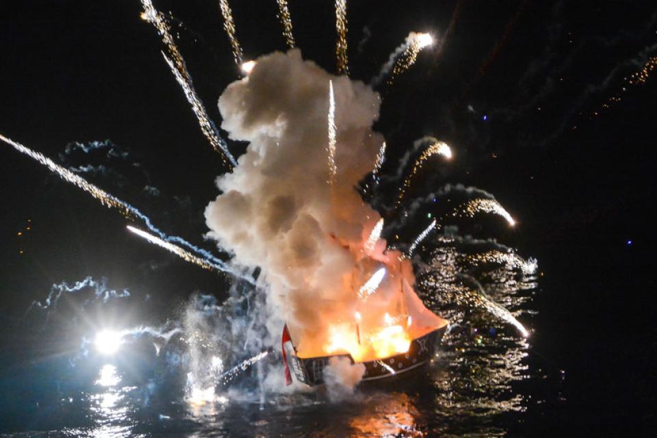Με μεγάλη επιτυχία πραγματοποιήθηκε η κορύφωση της γιορτής των Μιαουλείων με την αναπάρασταση της Ναυμαχίας του Γέροντα και την πυρπόληση ομοιώματος της οθωμανικής φρεγάτας.