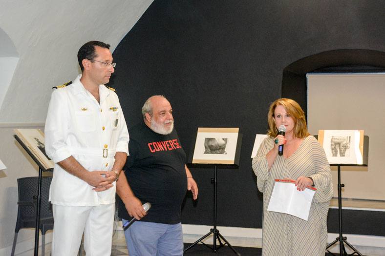 Στα εγκαίνια της έκθεσης που θα διαρκέσει μέχρι τις 19 Αυγούστου, μίλησε η Διευθύντρια του ΙΑΜΥ, Ντίνα Αδαμοπούλου όπου καλωσόρισε Γάλλους και Έλληνες και ο Εικαστικός Αλέξης Βερούκας ο οποίος αναφέρθηκε εκτός από τον καλλιτέχνη, στην ΑΕΝ, τον Διοικητή της, Αντιπλοίαρχο Ευάγγελο Δανόπουλο και τον ρόλο της Σχολής.