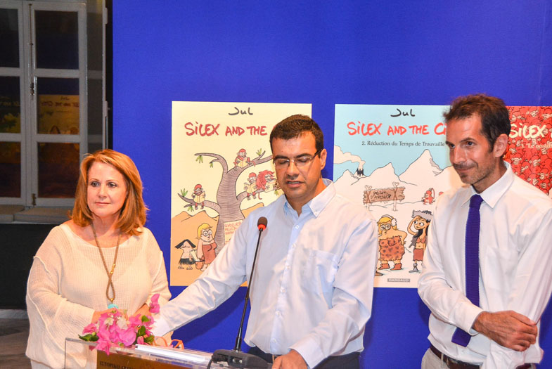 Για την έκθεση και τη δουλειά του σκιτσογράφου Jul, μίλησε η Διευθύντρια του ΙΑΜΥ, Ντίνα Αδαμοπούλου, η οποία παρουσίασε στο κοινό το προφίλ του Γάλλου καλλιτέχνη που ξεκίνησε την πορεία του με την πρώτη χιουμοριστική εφημερίδα στο σχολείο στα 13 του σχεδόν χρόνια και έφτασε να είναι σήμερα καταξιωμένος στον χώρο του και πολύ αγαπητός. Επίσης τον λόγο έλαβε και η Εκπαιδευτικός Θεοδώρα Σωτηροπούλου, η οποία γνωρίζει 30 χρόνια τώρα τον Jul, αναφέροντας ότι τα κόμικς του προσφέρουν διασκέδαση αλλά και γνώση. Aξίζει εδώ να πούμε, για την αγάπη του Jul για την Ελλάδα και την ιστορία της αλλά και την Ύδρα που επισκέπτεται εδώ και 15 χρόνια.