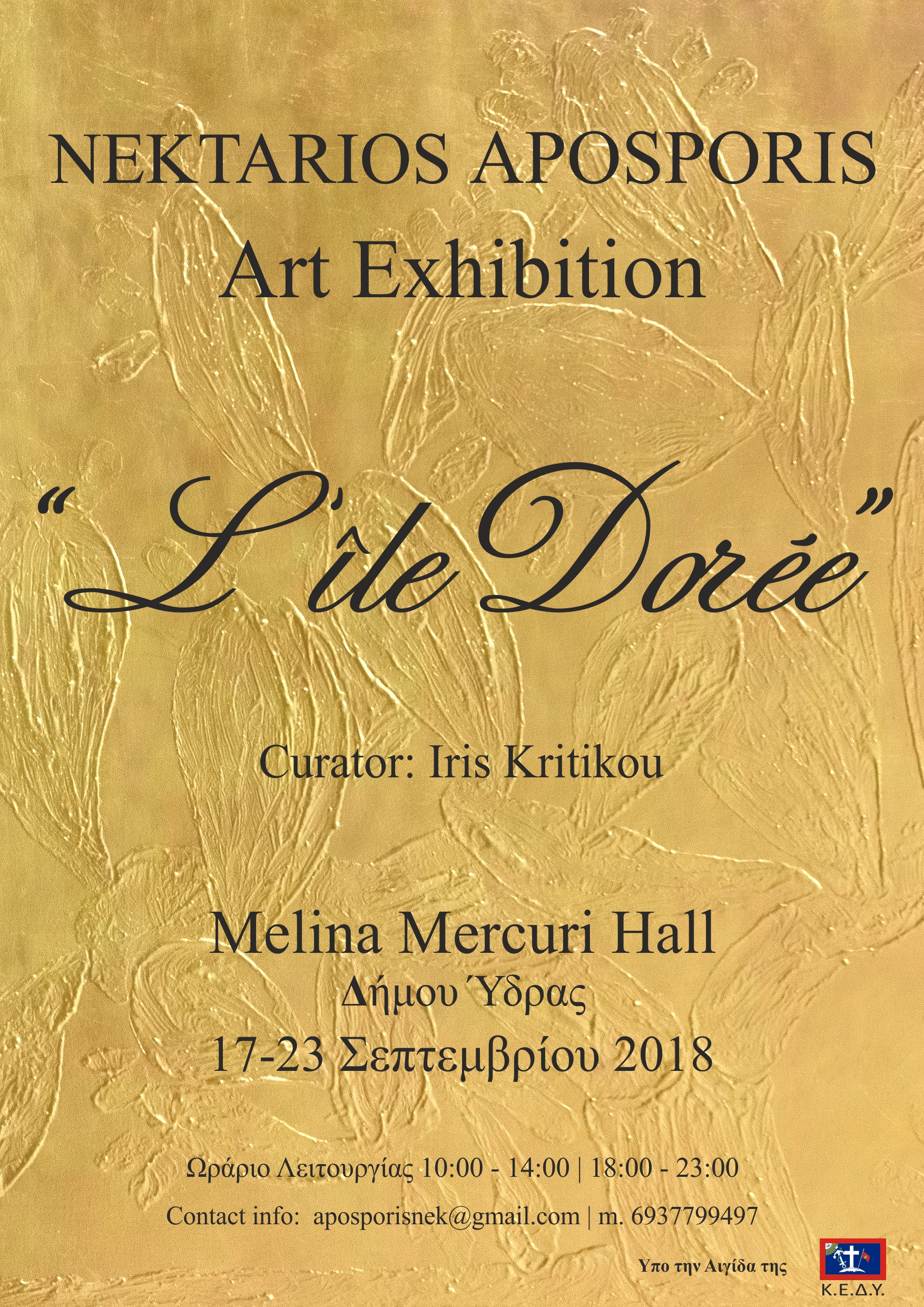 Στον εκθεσιακό χώρο της Αίθουσας Τέχνης & Συναυλιών «Μελίνα Μερκούρη» του Δήμου Ύδρας, στο Λιμάνι του νησιού, πραγματοποιείται από τη Δευτέρα 17 Σεπτεμβρίου ως και την Κυριακή 23 Σεπτεμβρίου 2018 η ατομική έκθεση ζωγραφικής του Νεκτάριου Αποσπόρη με τίτλο «L’Île Dorée».