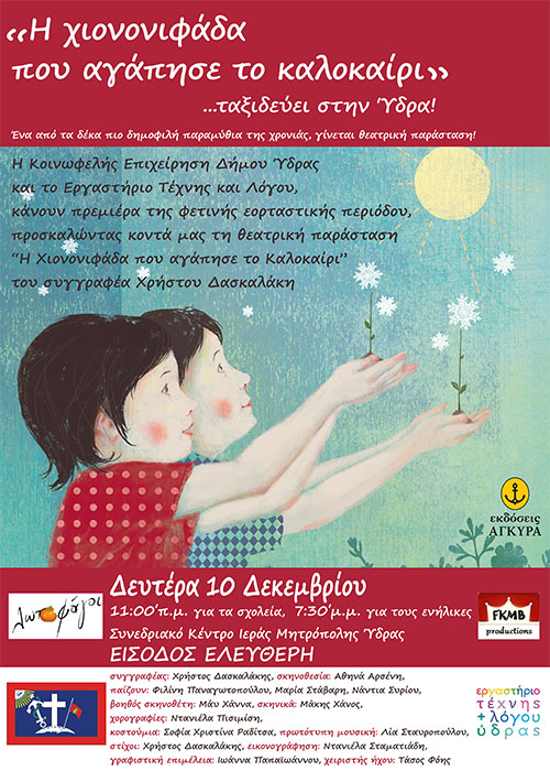 Στο πλαίσιο των εκδηλώσεων που ετοιμάζει για τα Χριστούγεννα η Κοινωφελής Επιχείρηση του Δήμου Ύδρας, τη Δευτέρα 10 Δεκεμβρίου θα παρουσιαστεί στη φιλόξενη αίθουσα του Ιερού Καθεδρικού Ναού της Ιεράς Μητρόπολης σε συνεργασία με το Εργαστήριο Τέχνης και Λόγου Ύδρας, η θεατρική παράσταση «Μια χιονονιφάδα που αγάπησε το καλοκαίρι» από το ομώνυμο παραμύθι του Υδραίου συγγραφέα Χρήστου Δασκαλάκη.