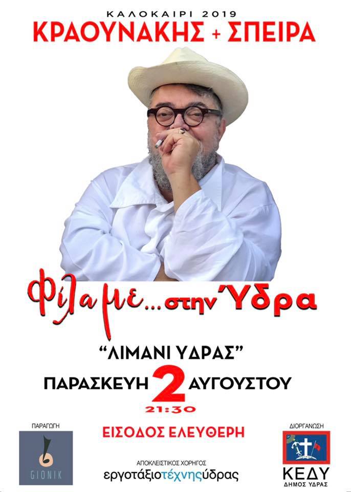 Ο Σταμάτης Κραουνάκης έρχεται στην Ύδρα για να μας ταξιδέψει μελωδικά την Παρασκευή 2 Αυγούστου 2019 και ώρα 21:30 στο λιμάνι.