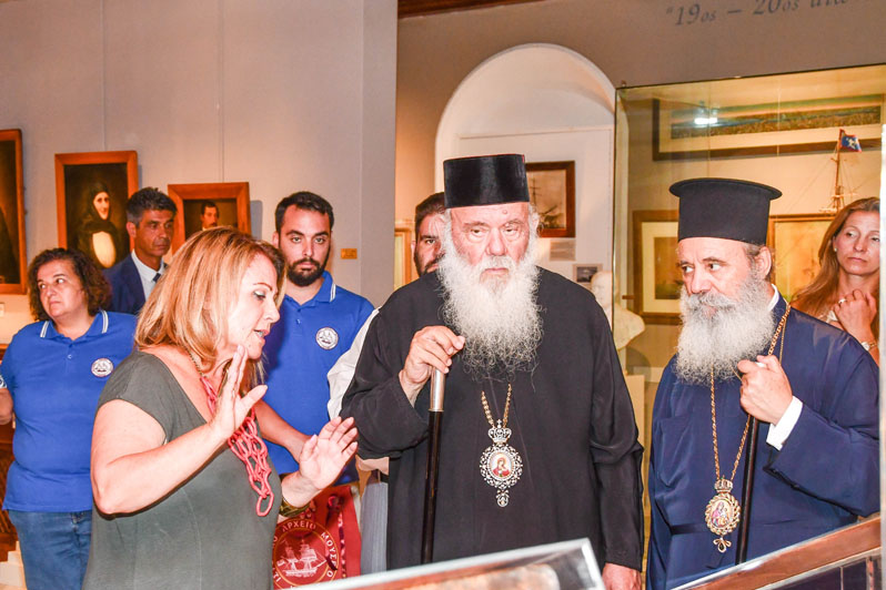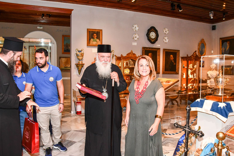 Στη συνέχεια ο Μακαριώτατος ξεναγήθηκε στην έκθεση με τα έργα του Πατέρα της Θαλασσογραφίας, Κωνσταντίνου Βολανάκη και ακολούθως μεταφέρθηκε στους άλλους χώρους, όπου η κ. Αδαμοπούλου σε μια πλήρη ξενάγηση, γνώρισε στον Αρχιεπίσκοπο τα κειμήλια, τη χάρτα του Ρήγα, την ασημένια λήκυθο με την καρδιά του Ανδρέα Μιαούλη, τον σταυρό του και όλα τα άλλα ιστορικά εκθέματα του ΙΑΜΥ.