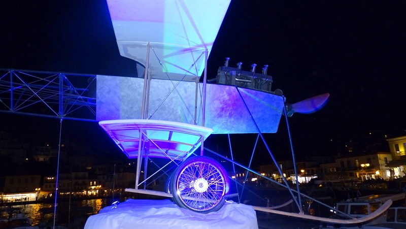 Τα τρία έργα του Νίκου Στεφάνου, που λειτουργούν σαν εξωτερικά εκθέματα, το ποστάλι, οι πύργοι και το υδροπλάνο, φωτισμένα όπως ήταν, έδειχναν μια ακόμα πιο διαφορετική και μαγική όψη.