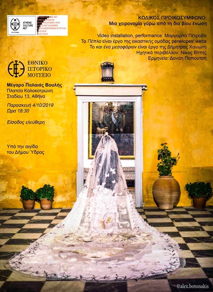 Την Παρασκευή 4 Οκτωβρίου 2019 και ώρα 18:30 το Εθνικό Ιστορικό Μουσείο, συμμετέχοντας στη Νύχτα Πολιτισμού Athens Culture Net 2019 που διοργανώνει ο Δήμος Αθηναίων και το Δίκτυο Πολιτισμού δήμου Αθηναίων Athens Culture Net, φιλοξενεί την εκδήλωση «Κωδικός: Προικοσύμφωνο.