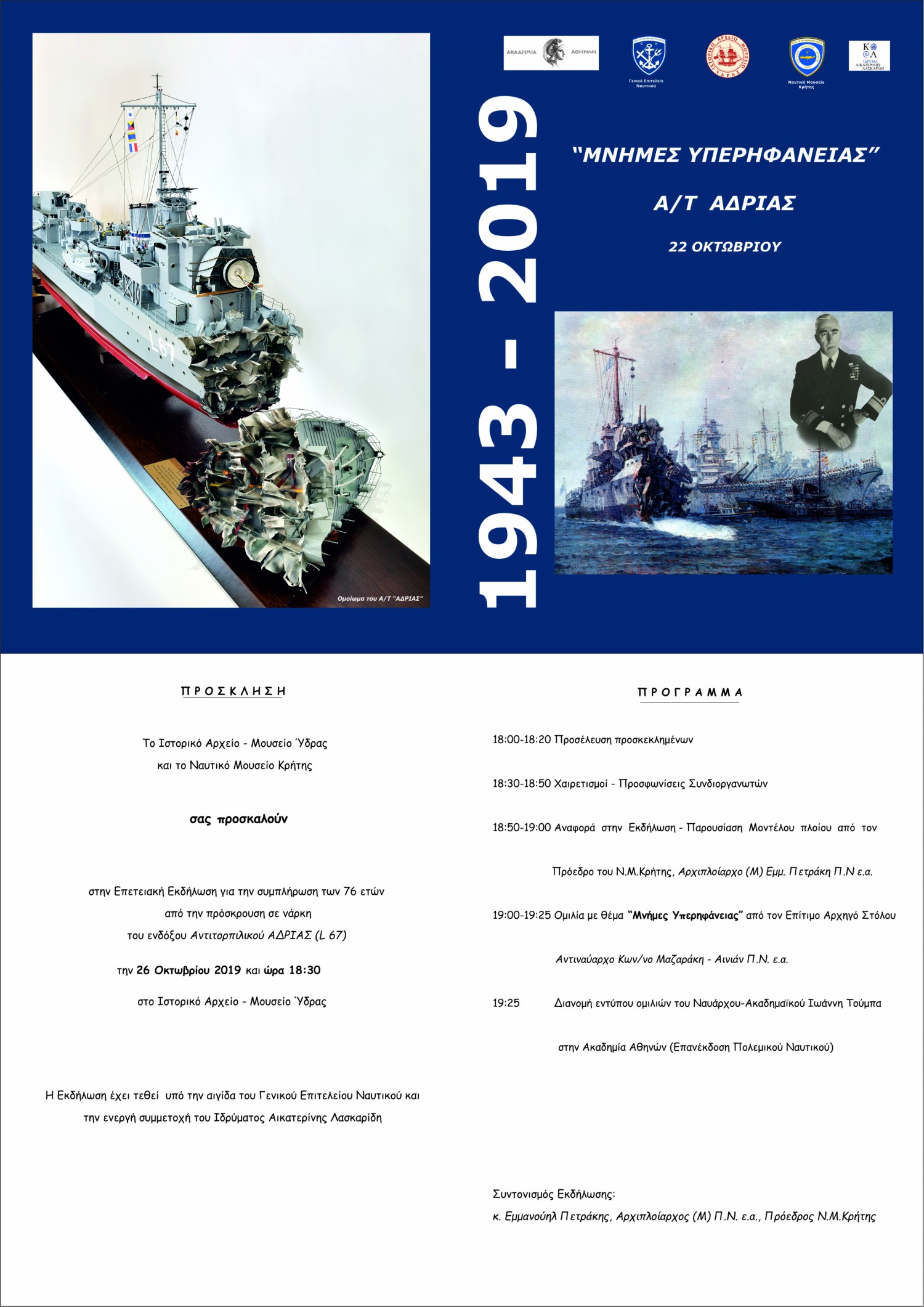 Το Ιστορικό Αρχείο-Μουσείο Ύδρας και το Ναυτικό Μουσείο Κρήτης, στο πλαίσιο των εορτασμών για την Εθνική Επέτειο της 28ης Οκτωβρίου και με αφορμή τη συμπλήρωση 76 ετών από την πρόσκρουση σε νάρκη του θρυλικού Αντιτορπιλικού “ΑΔΡΙΑΣ” (L 67), πραγματοποιούν στις 26 Οκτωβρίου και ώρα 18:30, στο Ιστορικό Αρχείο-Μουσείο Ύδρας την Επετειακή Εκδήλωση “Μνήμες Υπερηφάνειας”.